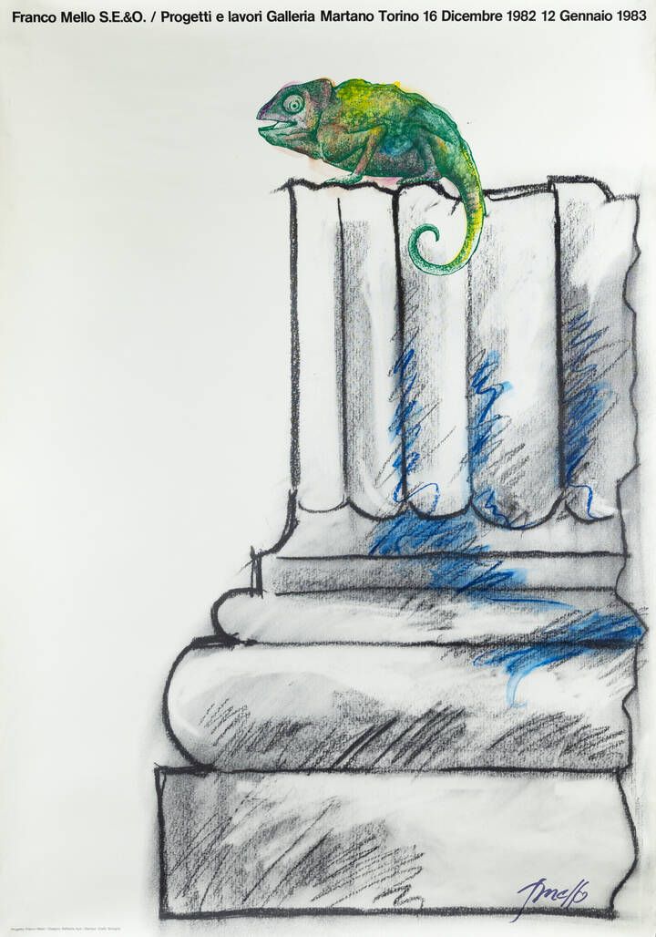 100x69 5 manifesto con interventi di colore autografi Opera firmata in basso a destra a stampa Manifesto della mostra Franco Mello S.E.&O. Progetti e lavori Galleria Martano Torino 16 dicembre 1982-12 gennaio 1983 Progetto: Franco Mello/ Disegno: Raffaella Ape/ Stampa: Grafis Bologna Bibl.:-F. Mello Opera prima. Storia illustrata di un'avventura creativa svagata poetica Arte su carta Torino 2023 ripr. a colori p. 115.