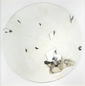 44 5x70 polimaterico su stoffa applicato su carta (60x75 foglio) Opera intitolata in basso a matita sulla carta [..]
