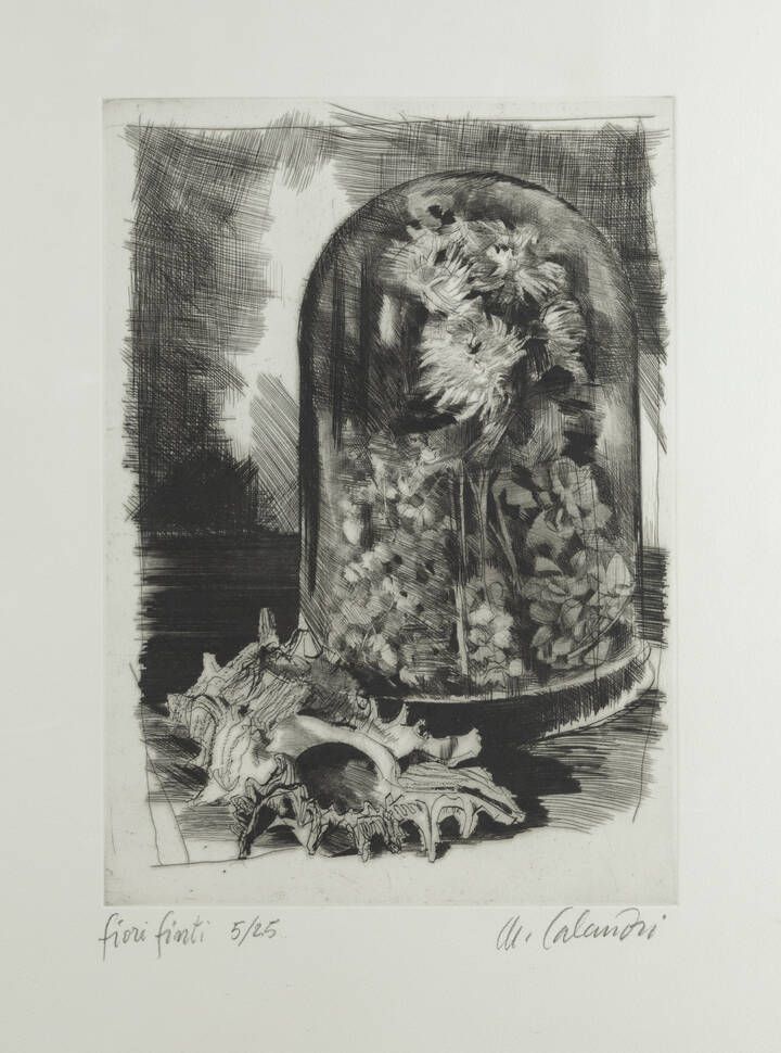 70x50 foglio 34 9x24 8 acquaforte e punta secca es. 5/25 Opera firmata in basso a destra intitolata e numerata in basso a sinistra (a matita sul foglio) Bibl.: M. Fagiolo Dell'Arco F. Fanelli V. Gatti (a cura di) Catalogo generale delle opere di Calandri. Le incisioni 1937/1991 Torino 1996 ripr. in b/n al n. 321 pag. 208
