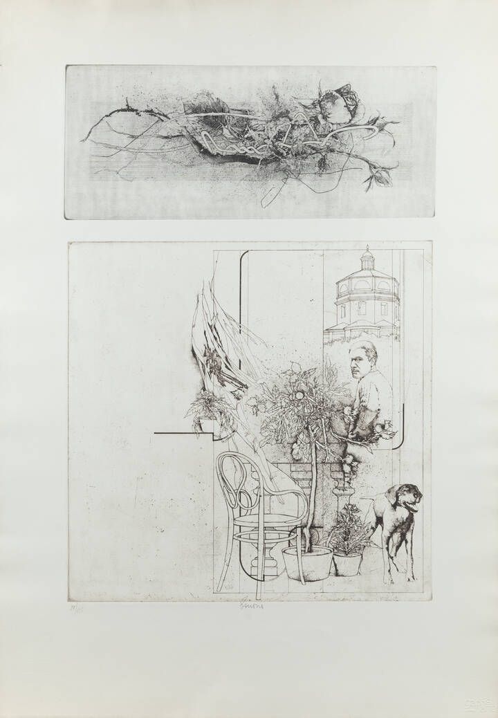 SERGIO SARONI Torino 1934 - 1991 : Uomo con cane in giardino  - Asta Grafica - Associazione Nazionale - Case d'Asta italiane