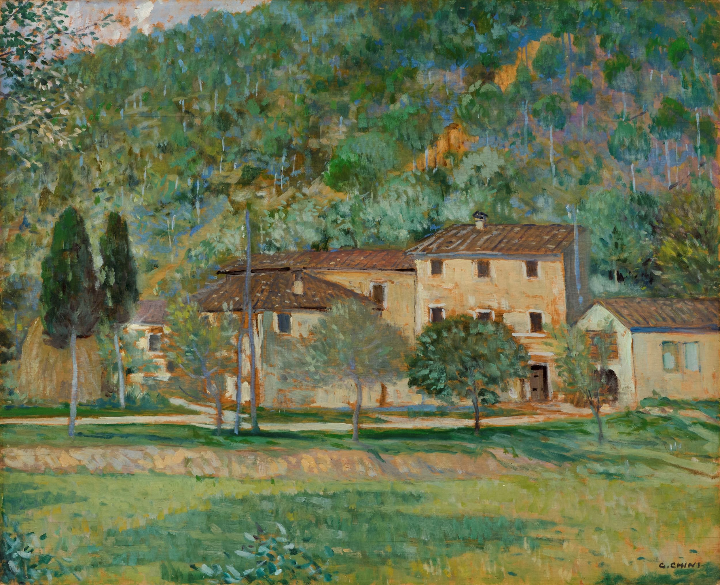 1943-45 ca. Firma in basso a destra: G. Chini; titolo, firma e luogo al verso: Il Casolare del Mulino / G. Chini. Firenze.