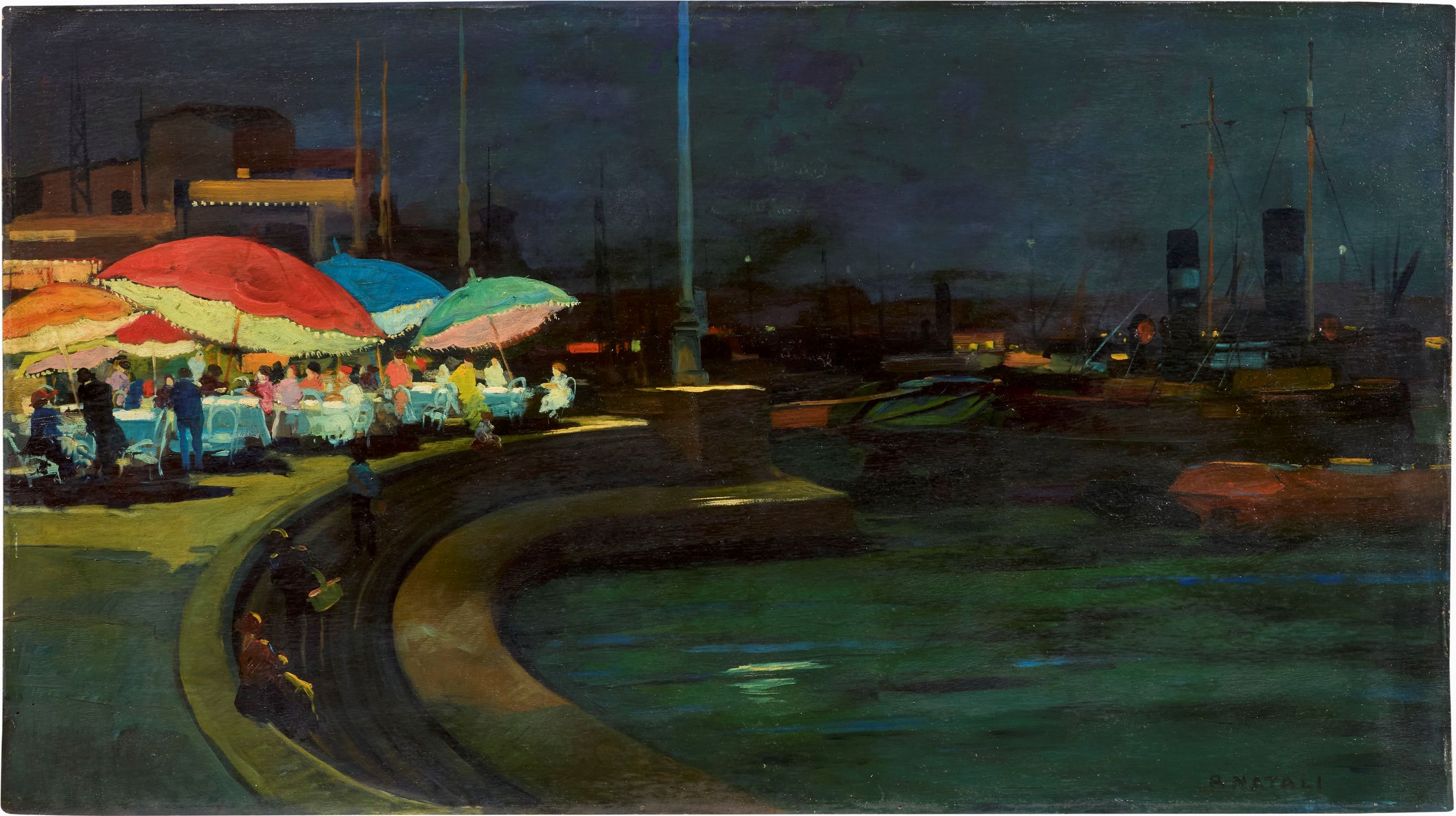 Olio su compensato, cm 65,5x114 Firma in basso a destra: R Natali. Al verso: etichetta con n. 331 e quattro timbri Raccolta Ugo Ughi: etichetta con n. 72 e quattro timbri Galleria d'Arte Athena, Livorno: etichetta Archivio Renato Natali, con n. 76, codice PILSNZOHWGZ, in data 17/07/2024.