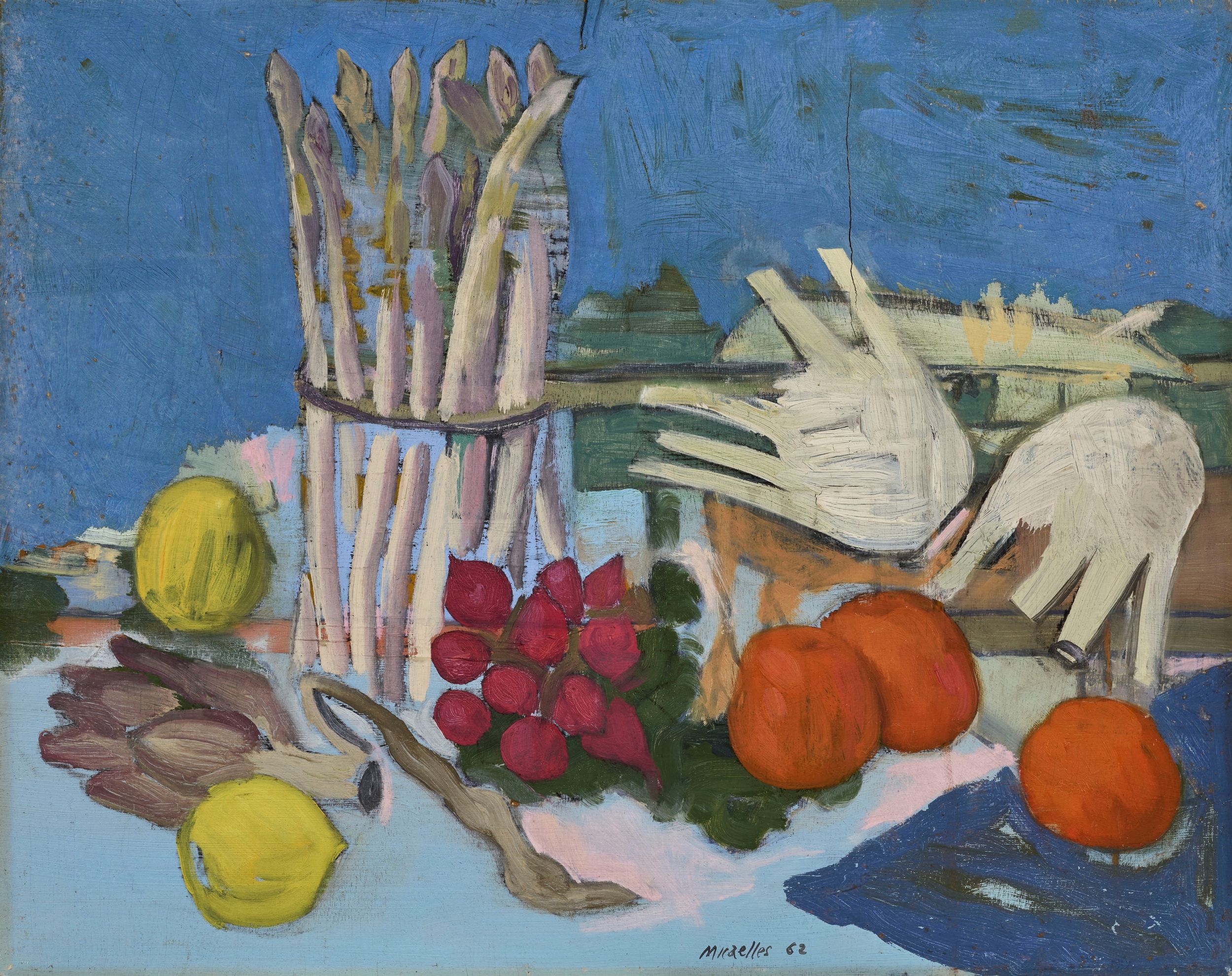 1962 Firma e data in basso al centro e al verso: Micaelles 62; titolo, firma e data al verso della cornice: N.M. 'Radicine rosse' Micaelles 62.