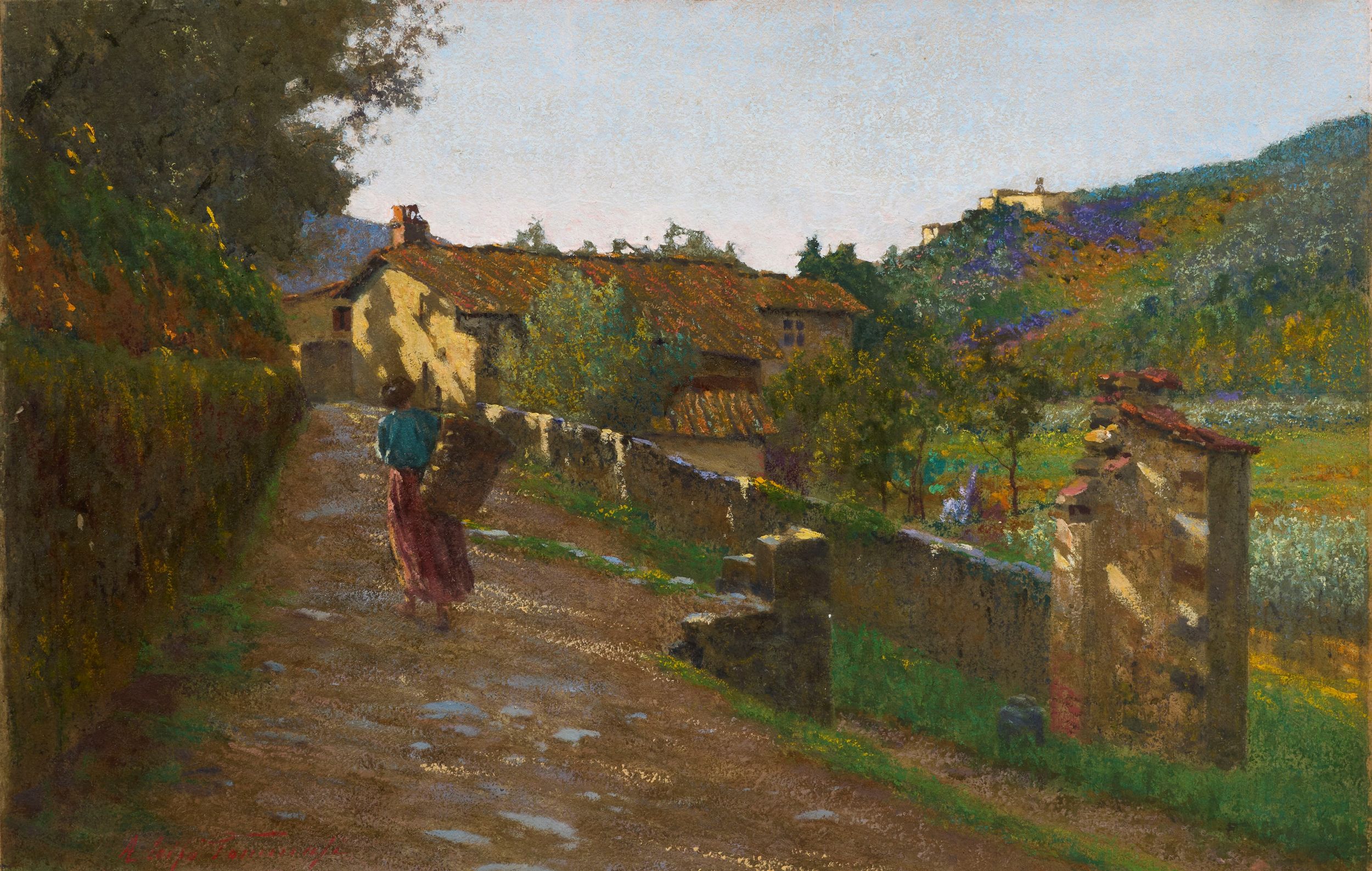Firma in basso a sinistra: Adolfo Tommasi.  Scritta al verso: Sprazzi di sole (Campagna [...]).
