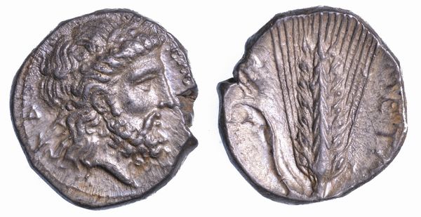 Testa laureata di Zeus a d.; dietro, Δ. R/ META Spiga con foglia a s. Johnston A 2.1. SNG Lloyd 373. SNG ANS 451. SNG Manchester 202. Gillet 193. Historia Numorum Italia 1557. g. 7,93. Diam. mm. 20,43. Arg. Esemplare di finissimo stile. SPL