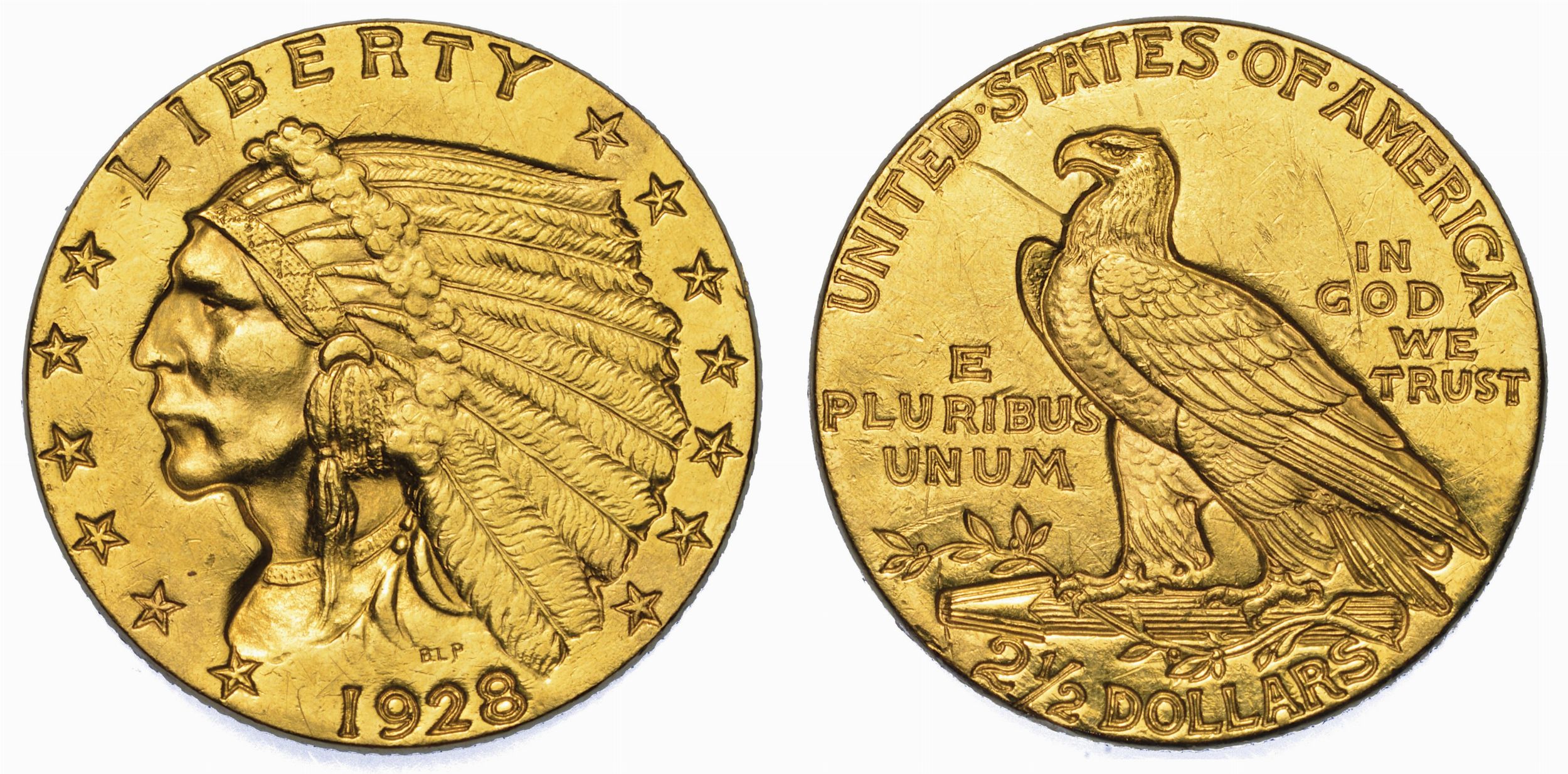 USA. REPUBLIC. 2,5 Dollars Indian Head 1928. Zecca di Philadephia, Pennsylvania.