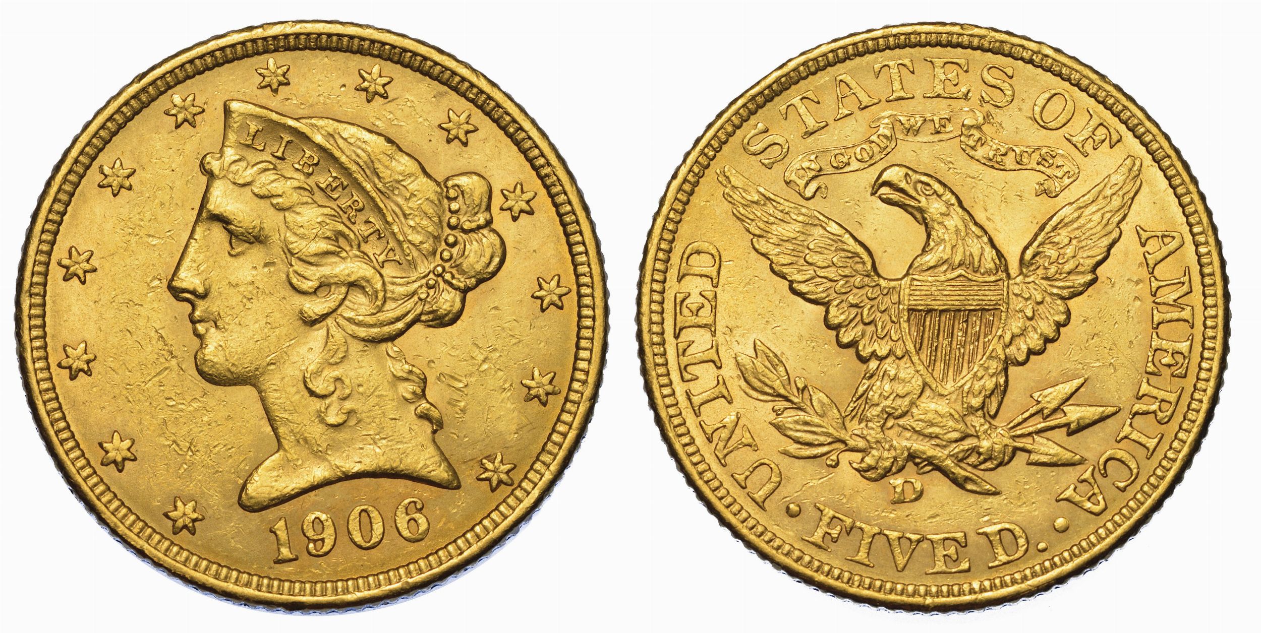 USA. REPUBLIC. 5 Dollars “Coronet Head” 1906. Zecca di Denver, Colorado.