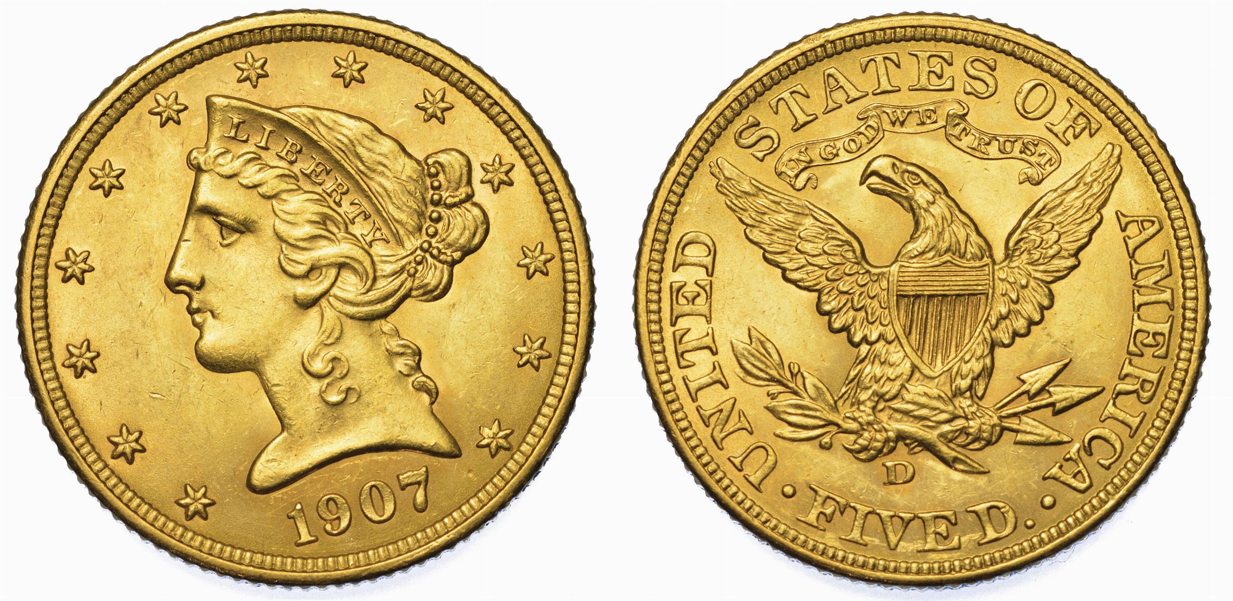 USA. REPUBLIC. 5 Dollars “Coronet Head” 1907. Zecca di Denver, Colorado.