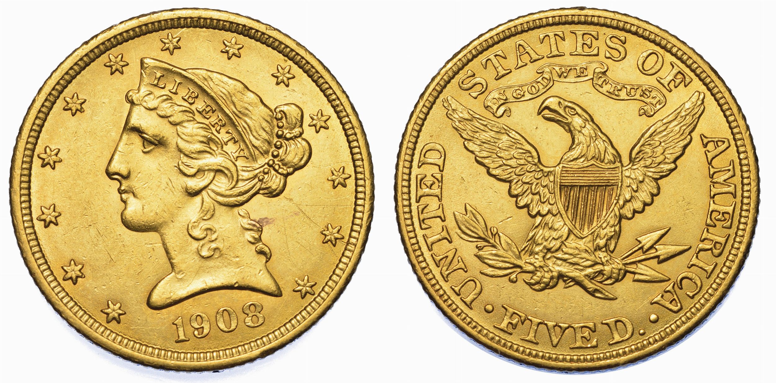 USA. REPUBLIC. 5 Dollars “Coronet Head” 1908. Zecca di Philadephia, Pennsylvania [..]