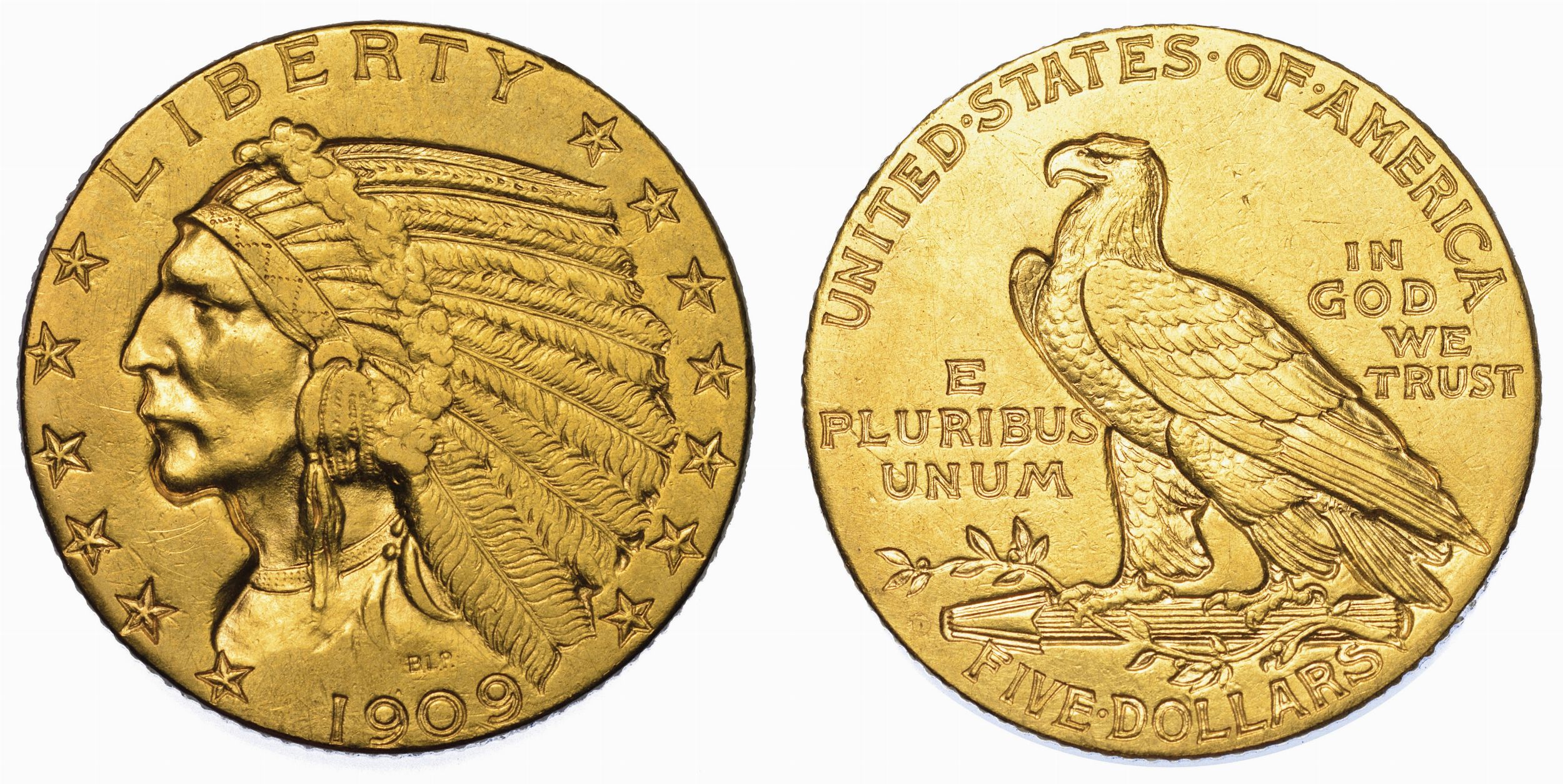USA. REPUBLIC. 5 Dollars Indian Head 1908. Zecca di Denver, Colorado.