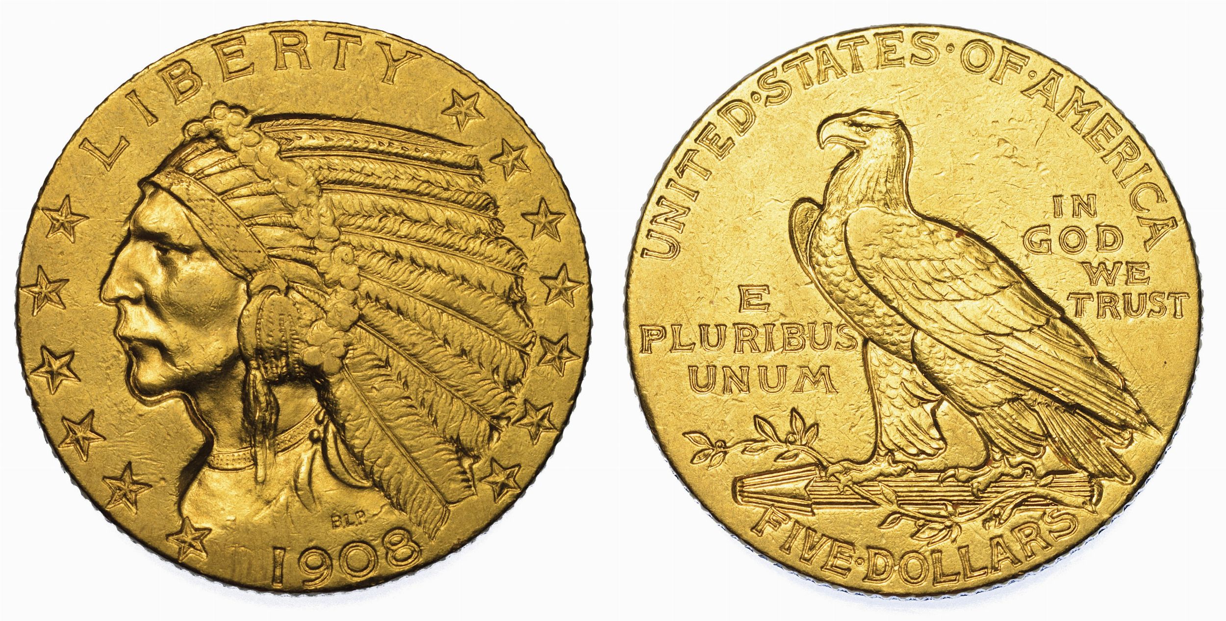 USA. REPUBLIC. 5 Dollars Indian Head 1908. Zecca di Philadephia, Pennsylvania.