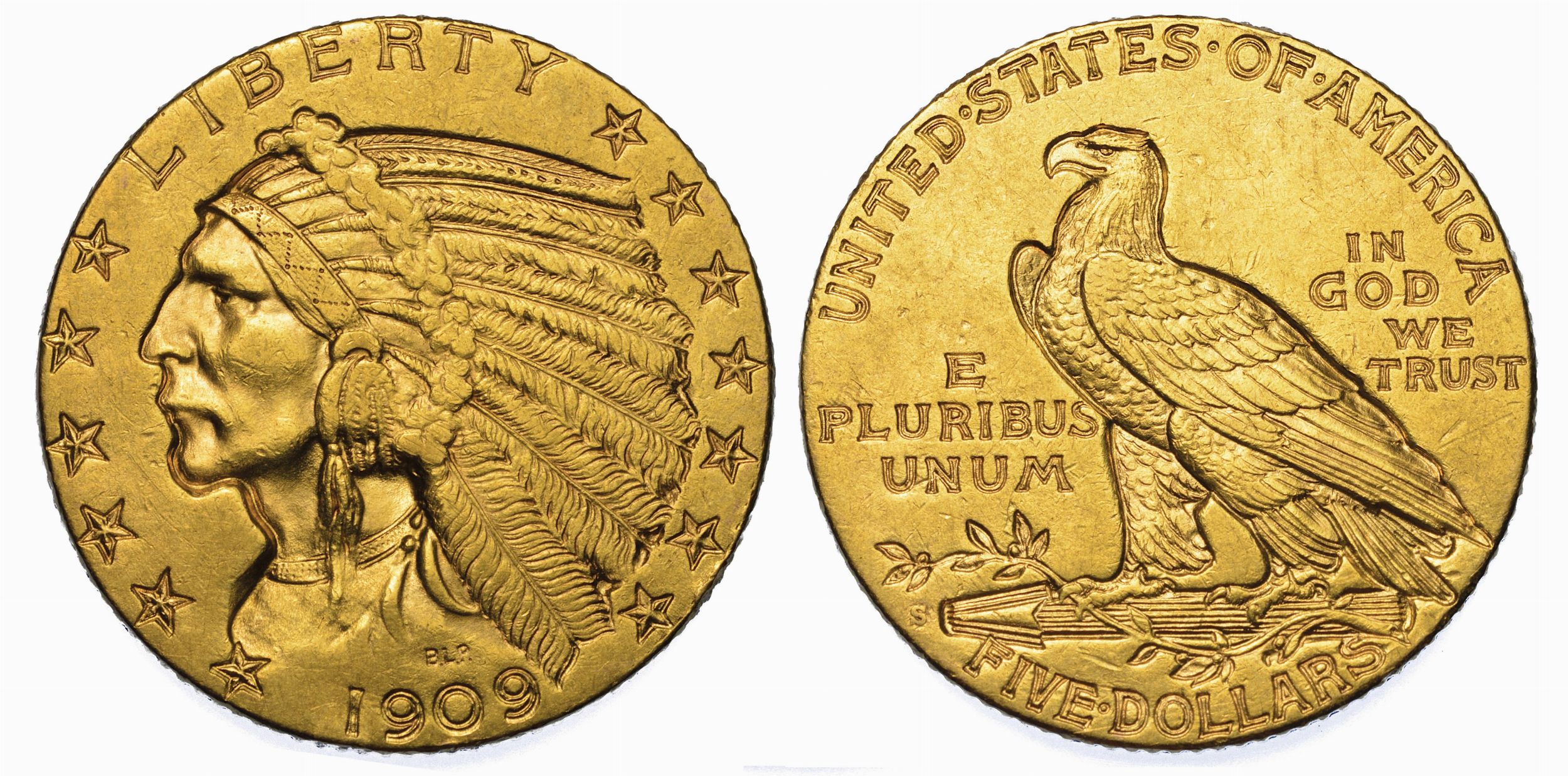 USA. REPUBLIC. 5 Dollars Indian Head 1909. Zecca di San Francisco, California.