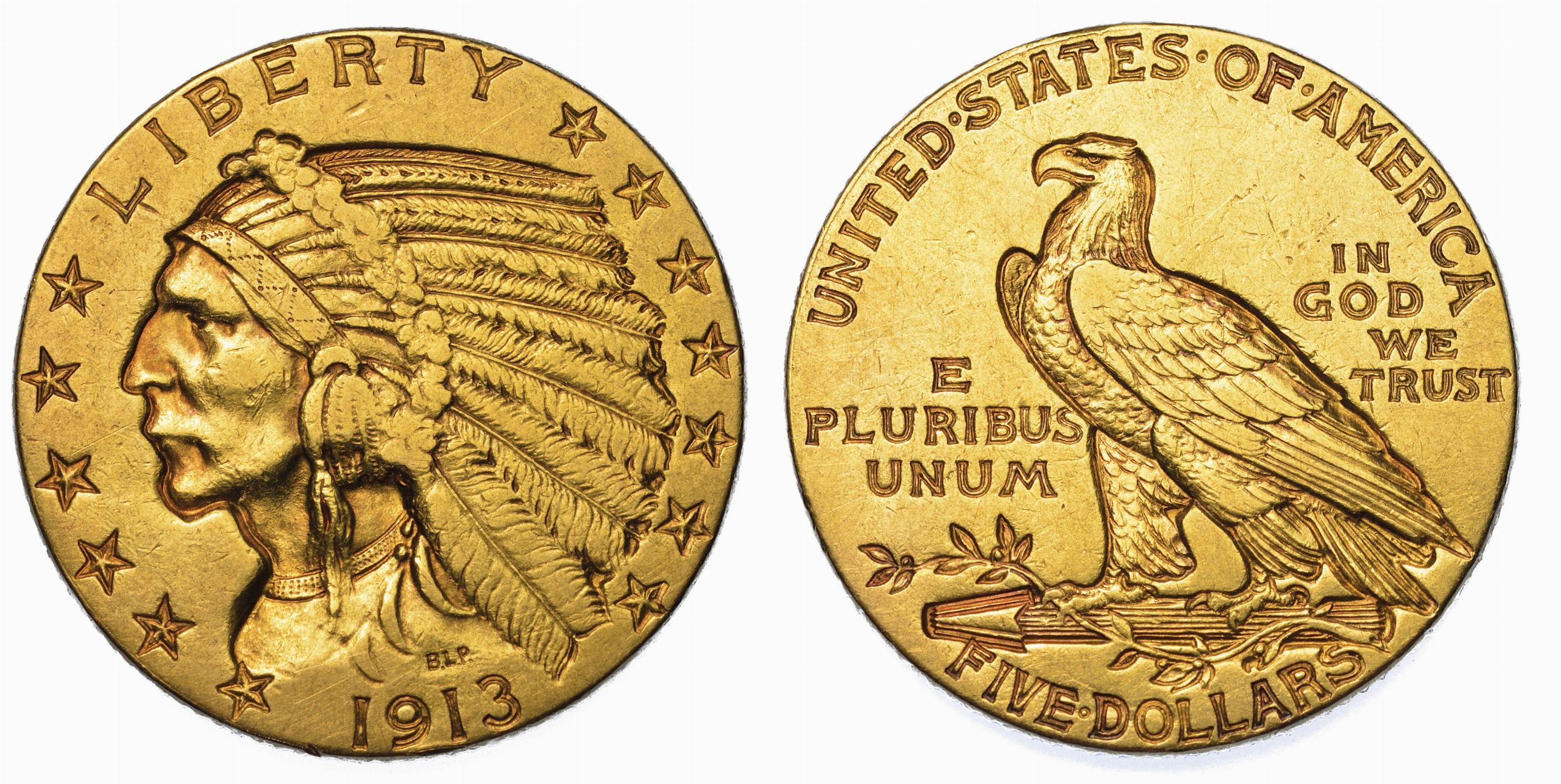 USA. REPUBLIC. 5 Dollars Indian Head 1913. Zecca di Philadephia, Pennsylvania.