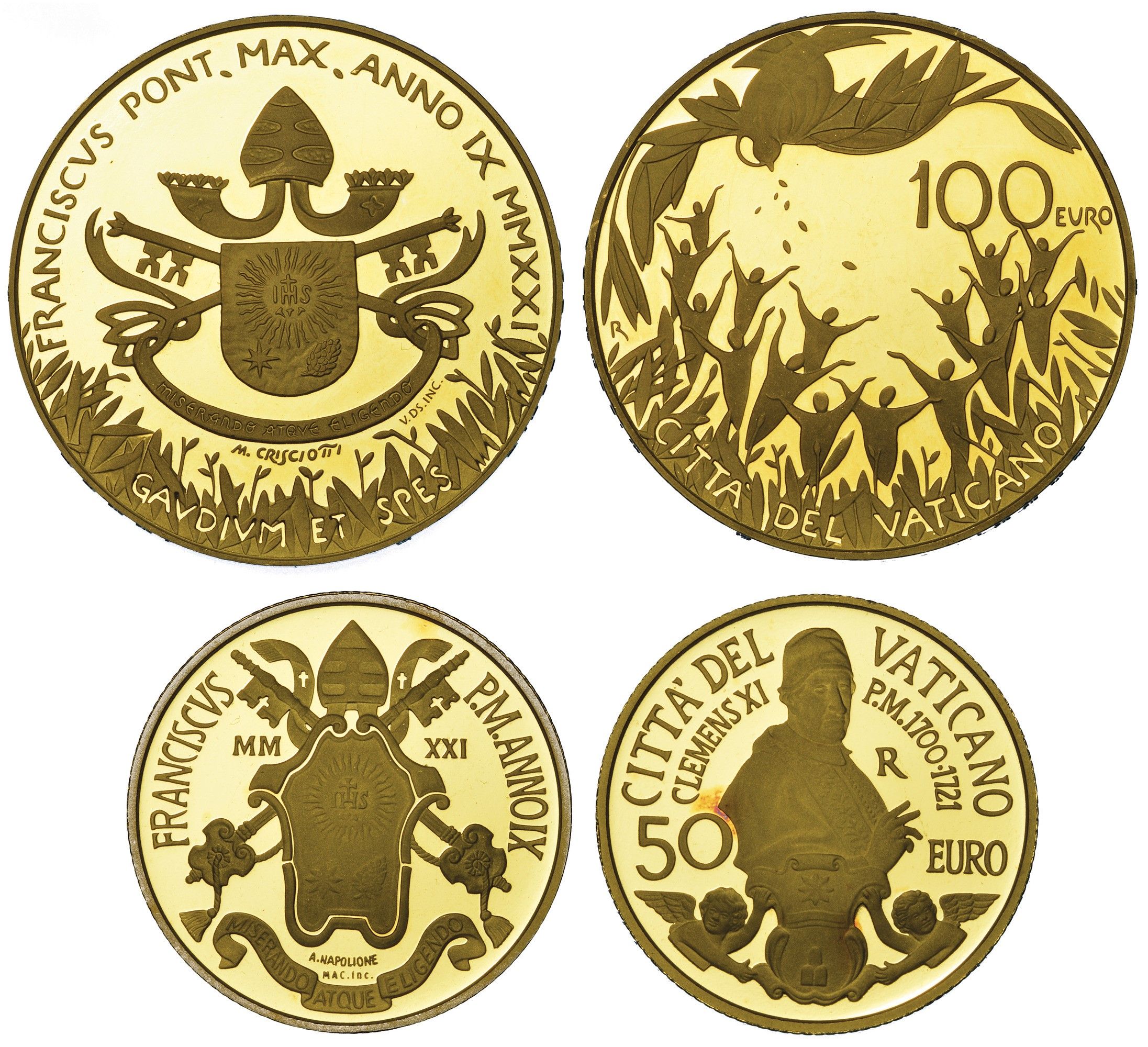 100 Euro A. IX (2021) - 50 Euro A. IX (2021). g. 30,00; g. 15,00. Diam. mm. 35,00; Diam. mm. 28,00. Oro (titolo 917). FDC