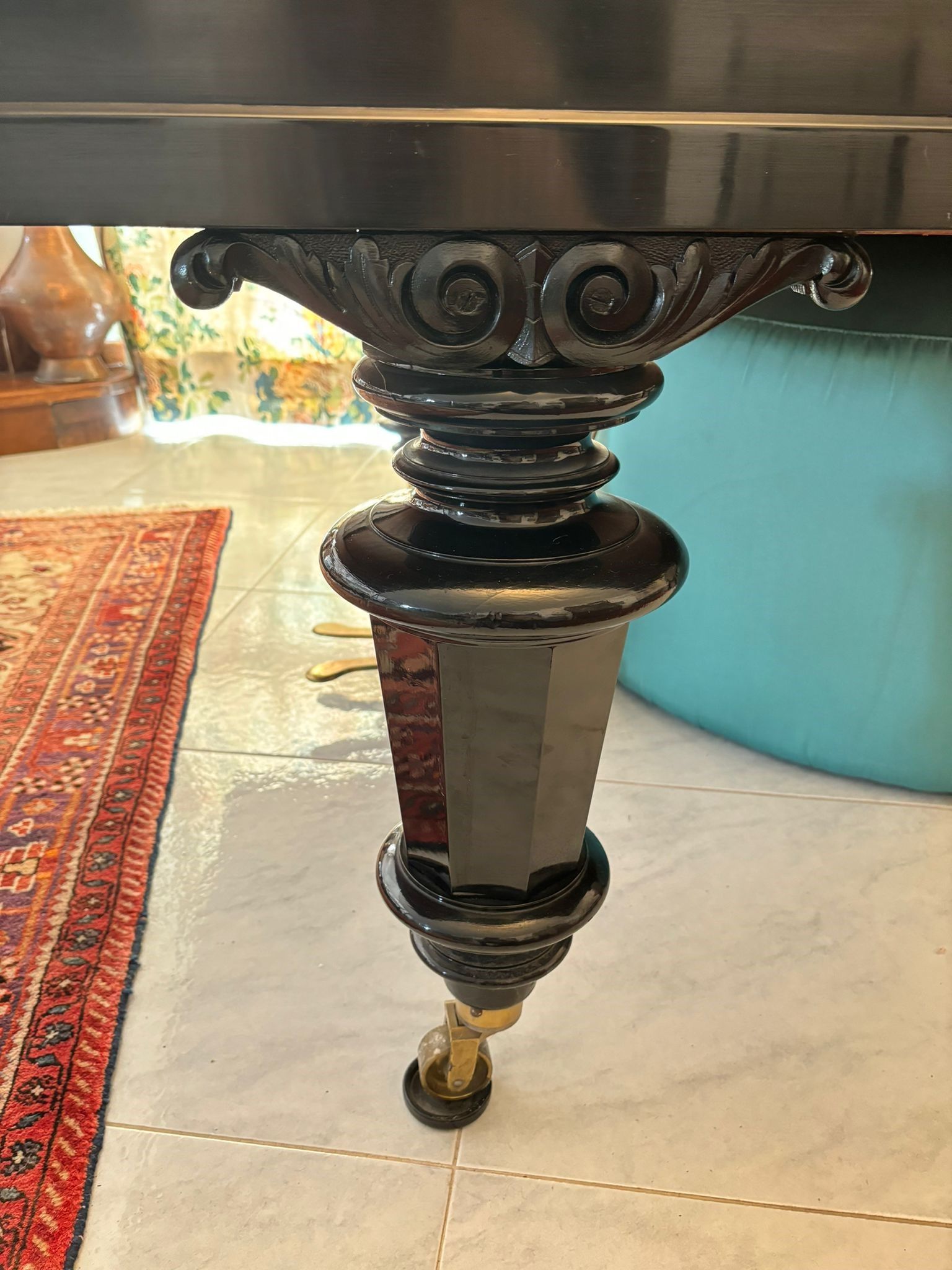 1878 Pianoforte Bechstein nero con finitura lucida, gambe tornite provviste di rotelle, tastiera a 88 tasti originali in avorio, leggio traforato e decorato con volute, ottime condizioni.