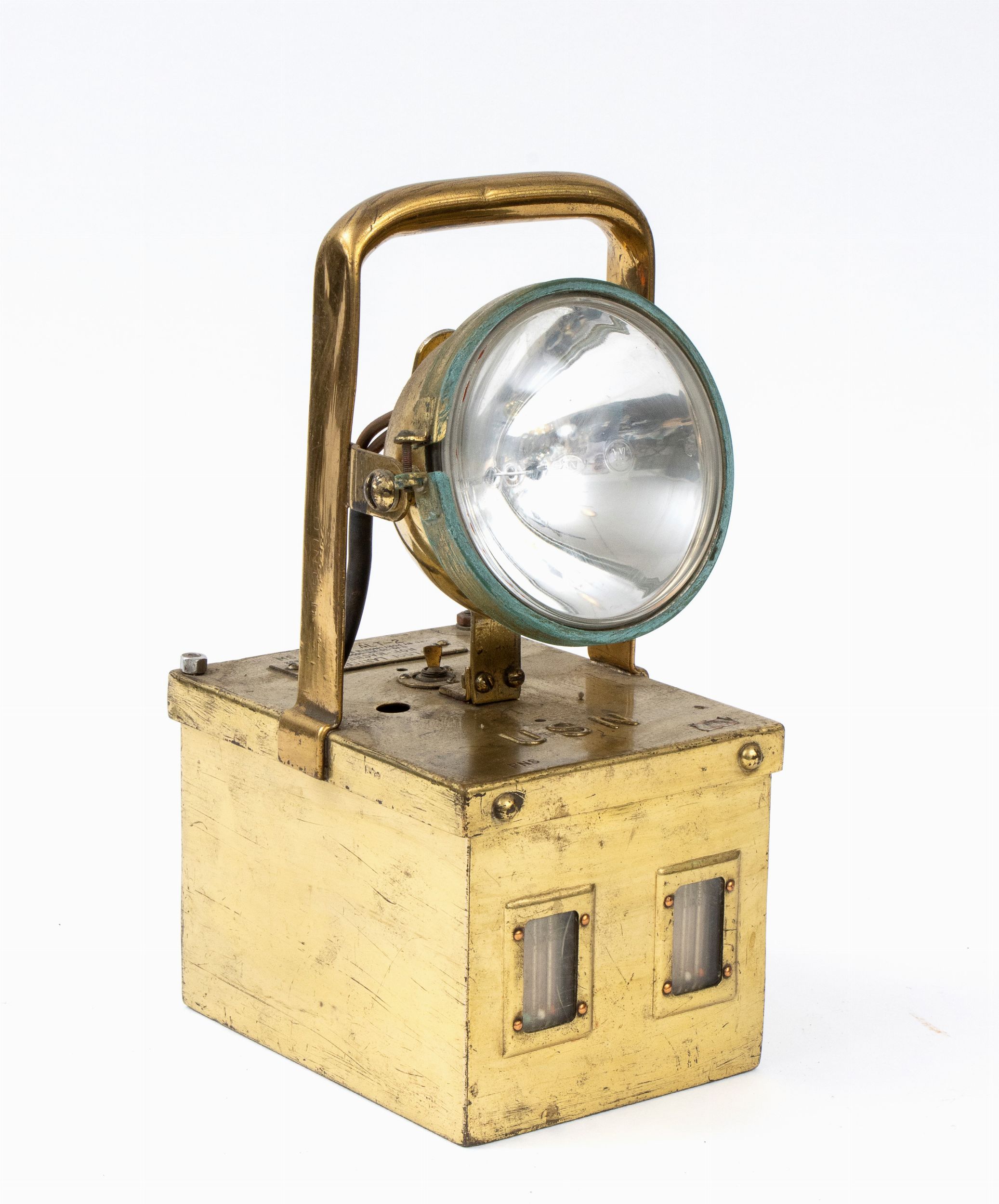 cm 40x22x17 Lampada da lavoro portatile della Marina degli Stati Uniti della seconda guerra mondiale con batterie; lente in vetro originale, finestrelle di visualizzazione del vano batteria e tutti i pezzi originali. Corpo in lamiera d'ottone, marcato USN; Non magnetic, MFD by Portsmouth Naval. Funzionamento non testato.