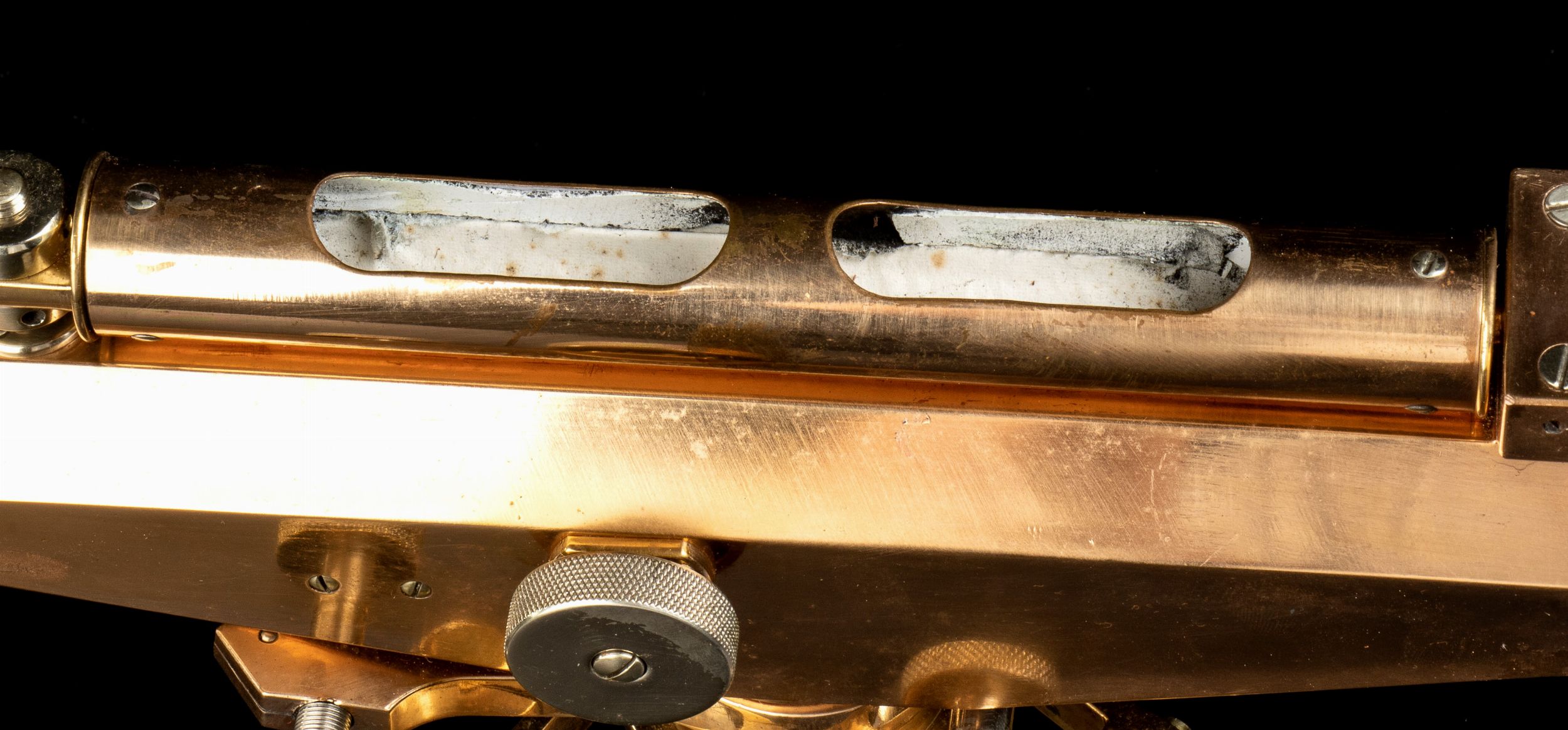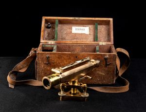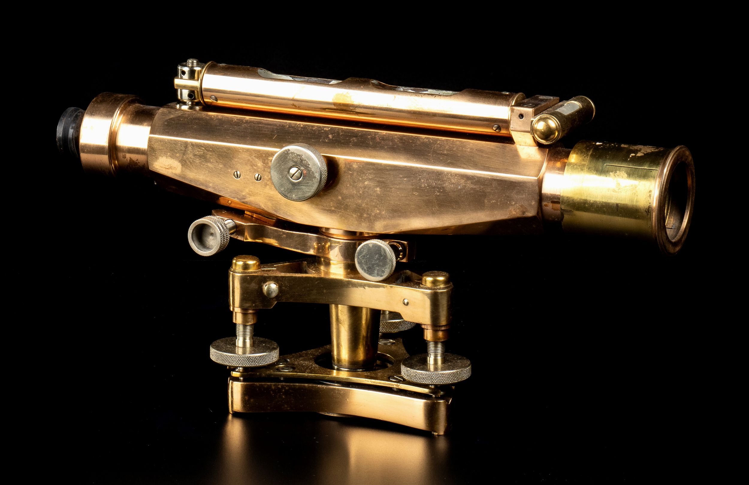 Naval Antiques... Strumento topografico, livella a cannocchiale (surveyor's theodolite / level), in ottone tornito, codice 46798, mancante delle due ampolline, revisione datata 1968. Scatola in legno con cinghia per il trasporto