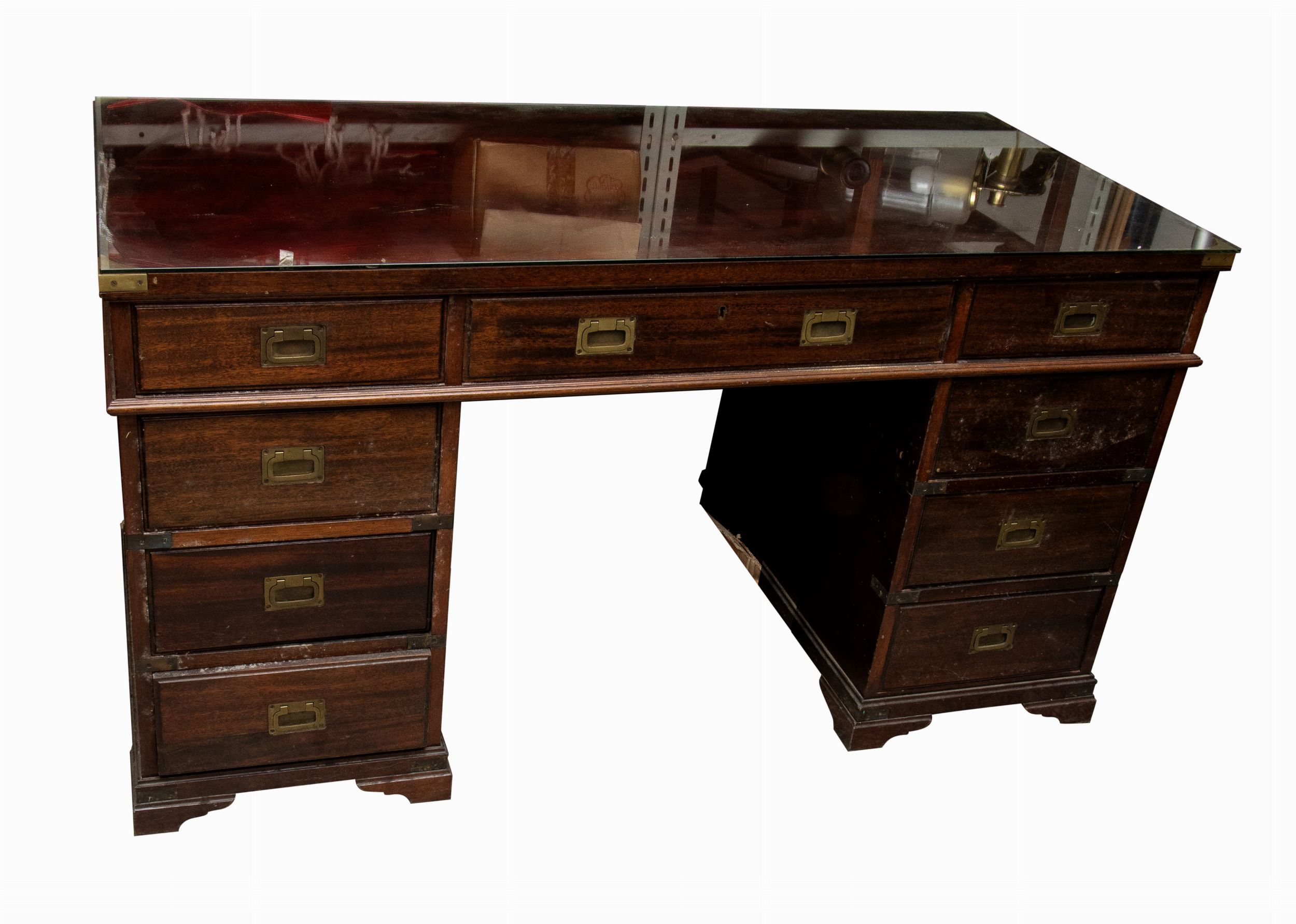 Scrivania navale originale in mogano marino, angolari in ottone e ripiano di cristallo con quattro cassetti per lato e uno centrale ; discrete condizioni.