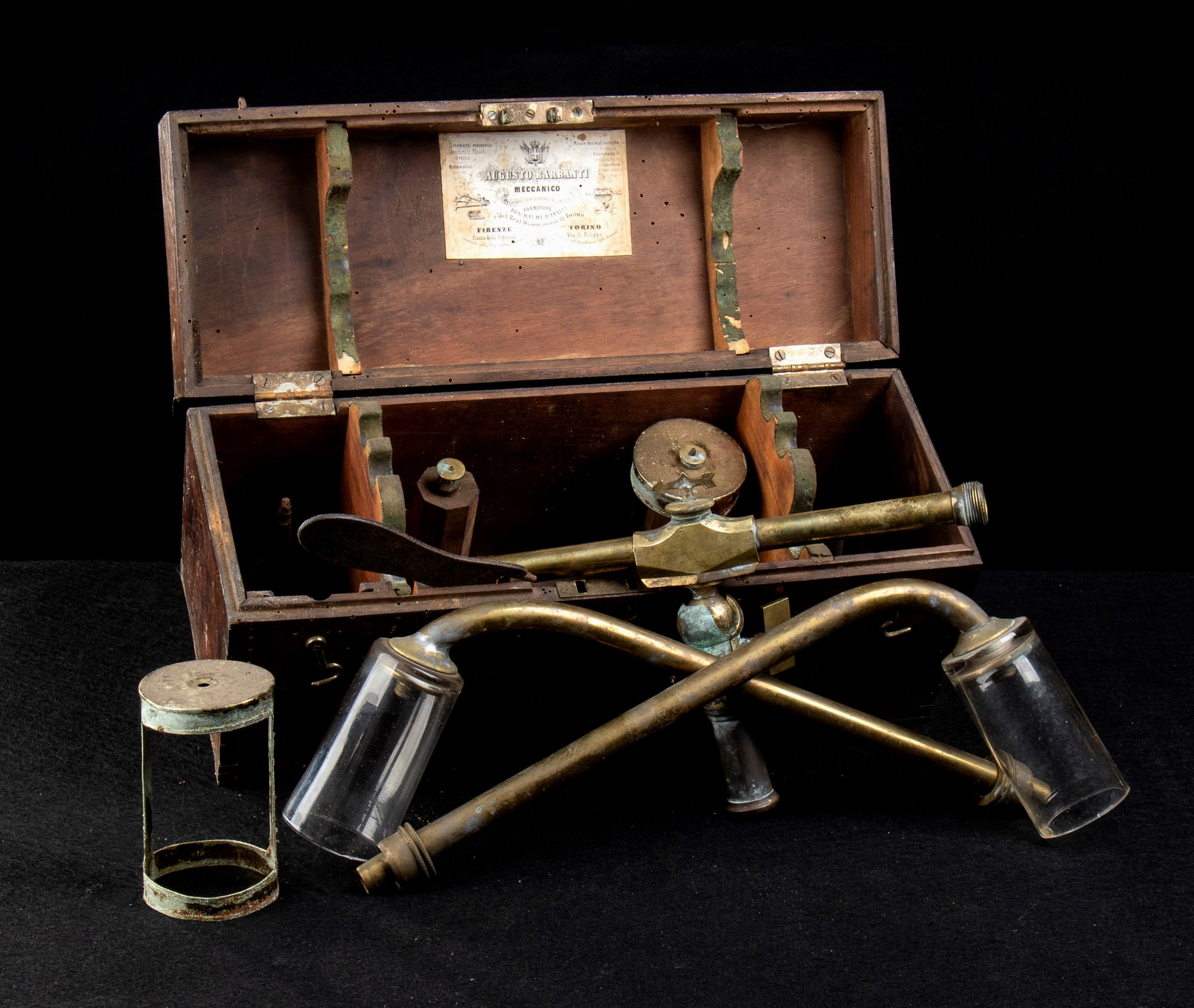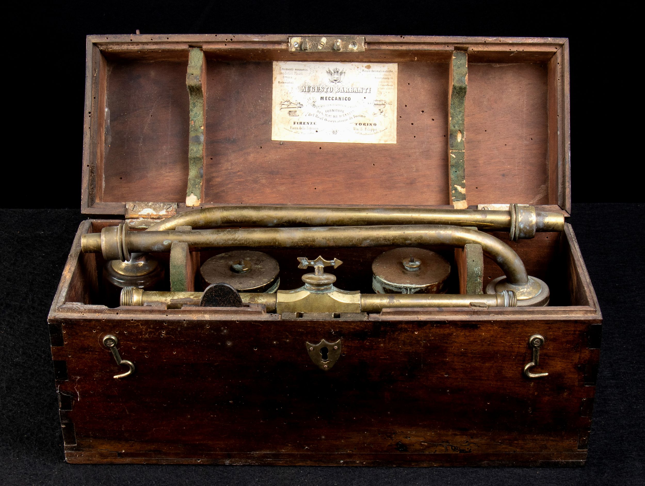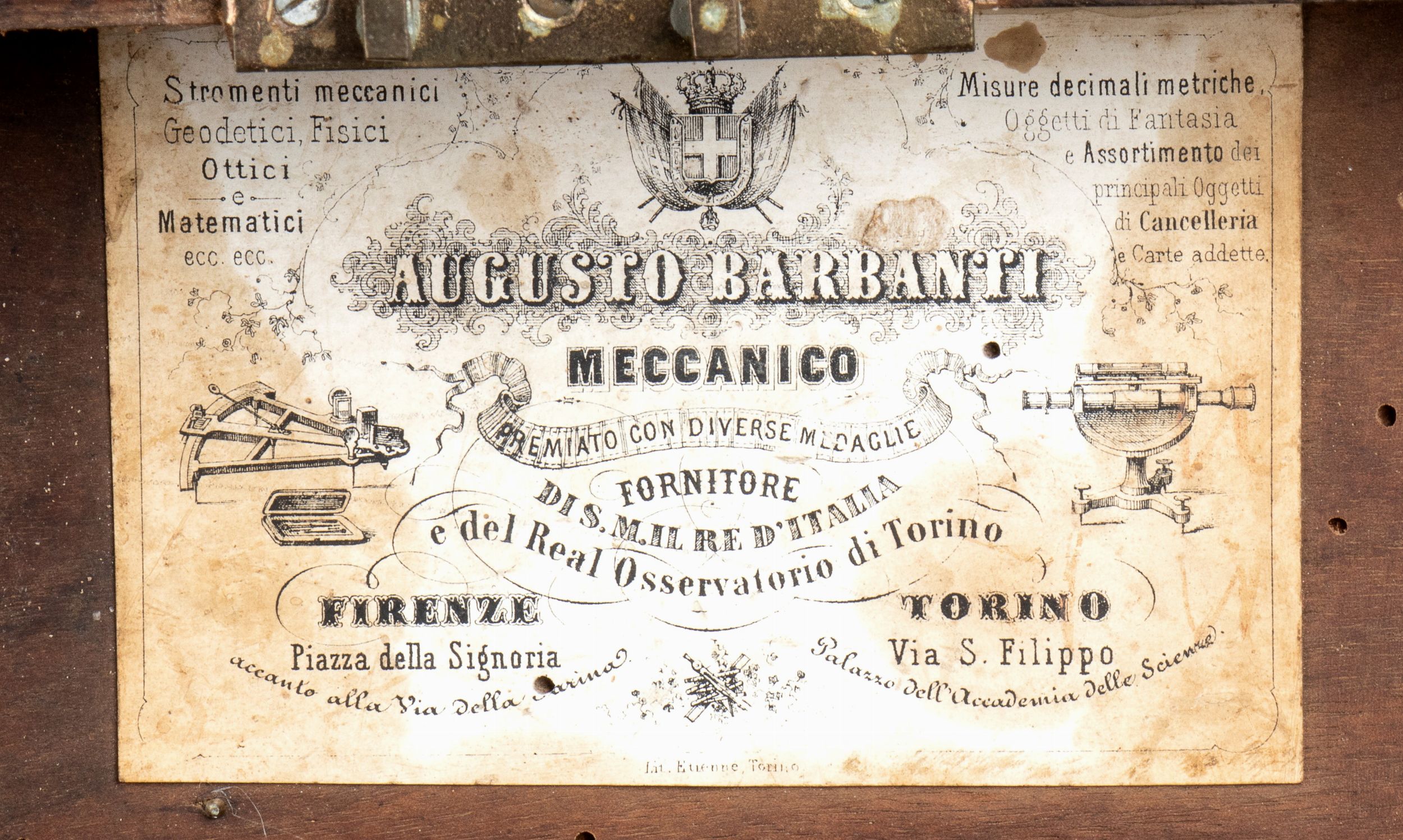 Naval Antiques... Non meglio identificato, strumento ottico/meccanico in metallo con parti in vetro, nella sua scatola di legno originale, con targhetta AUGUSTO BARBANTI MECCANICO FORNITORE DI S.M. IL RE D'ITALIA e del Real Osservatorio di Torino.