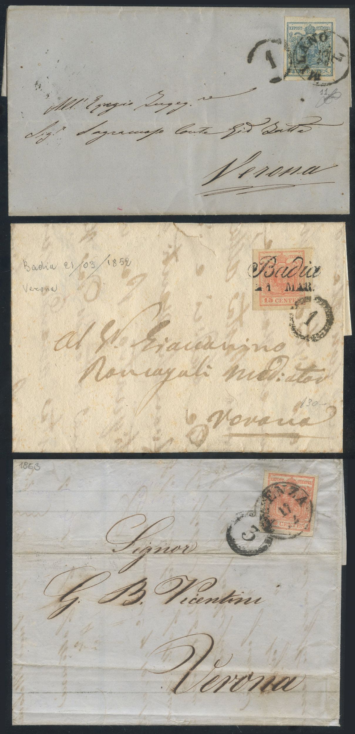 1850 - tre interessanti lettere con l'affrancatura annullata tramite l'annullo di distribuzione ''1'' e ''3''. (A+)