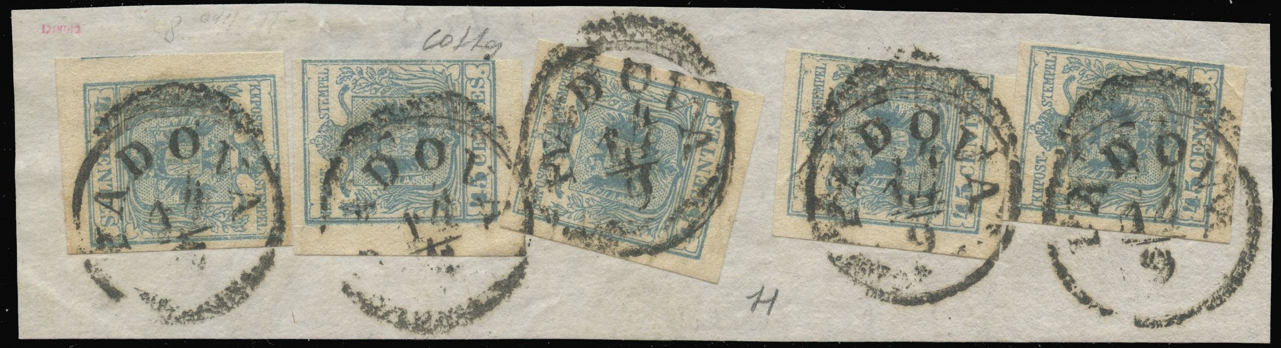 1850 - Interessante affrancatura composta da 5 esemplari del 45 cent. azzurro ardesia n.11 su di un unico frammento di lettera. Non comune. (A/A-) (Cert. Colla)