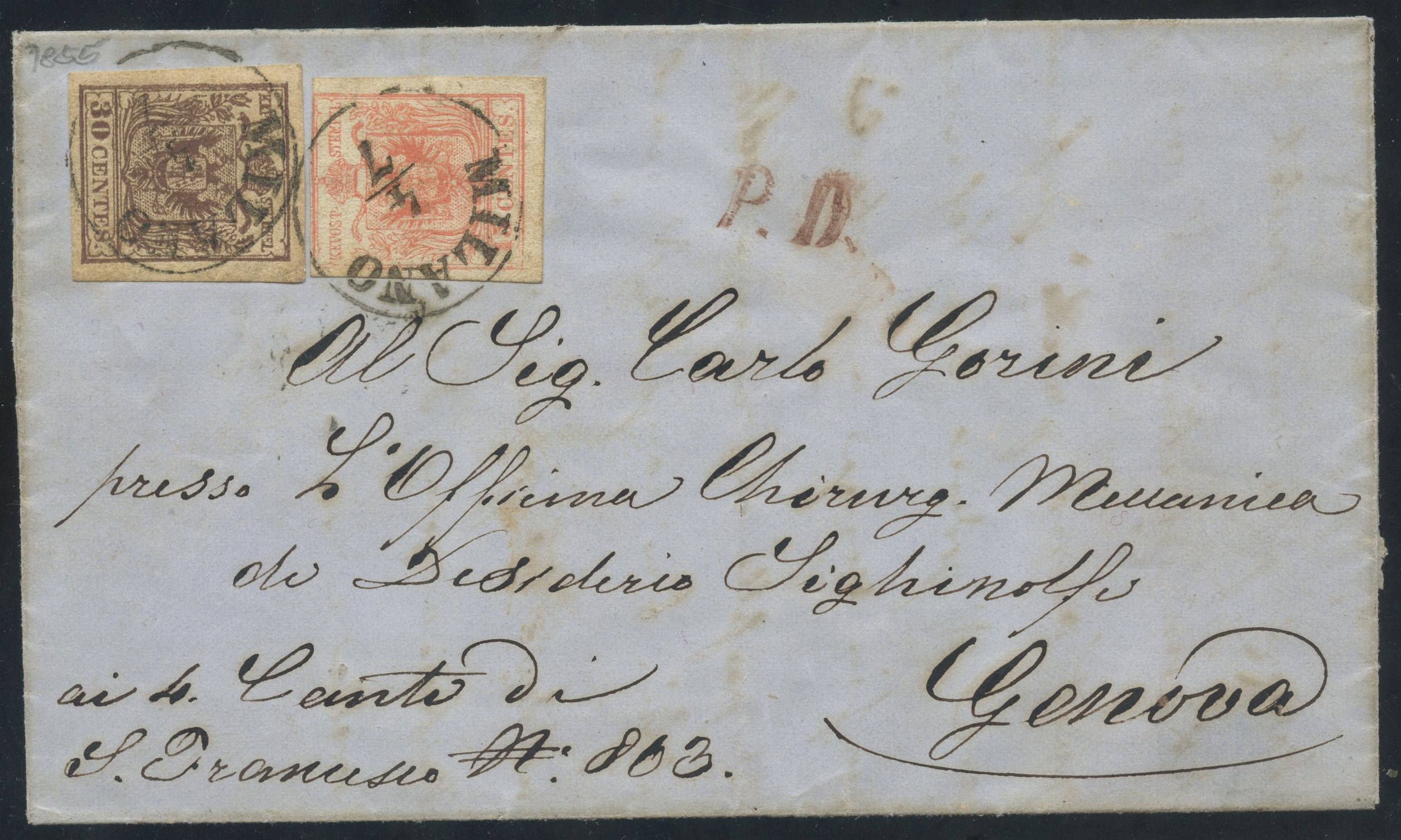 04.07.1855 - Lettera Da Milano per Genova affrancata per 45 centesimi tramite un 15 cent. rosa salmone n. 6e + 30 cent. bruno lillaceo n.9. (A-)