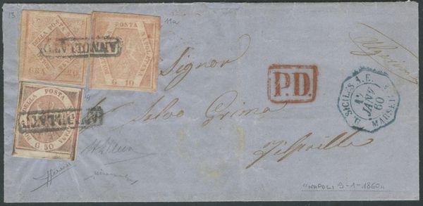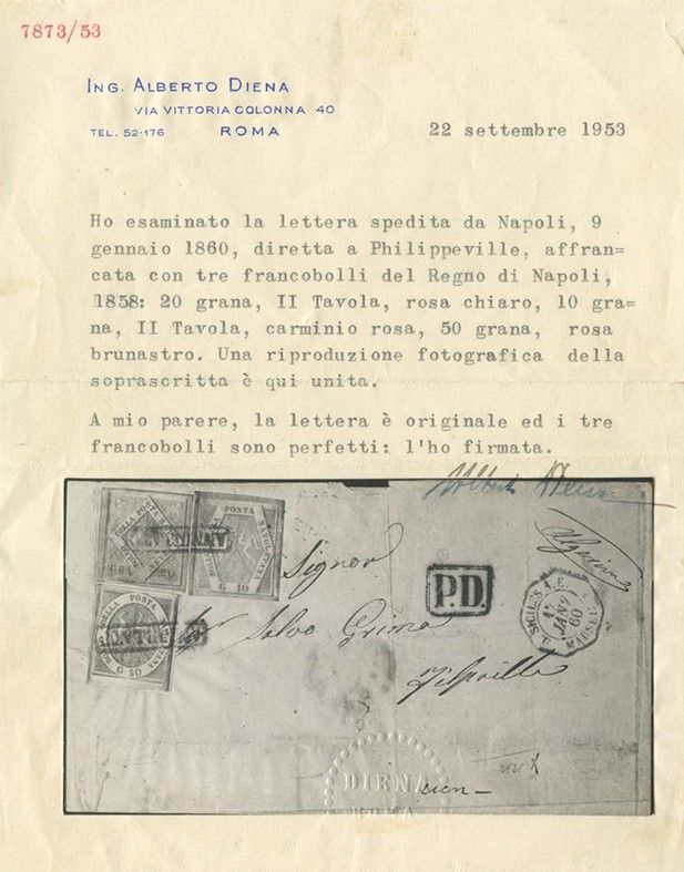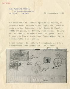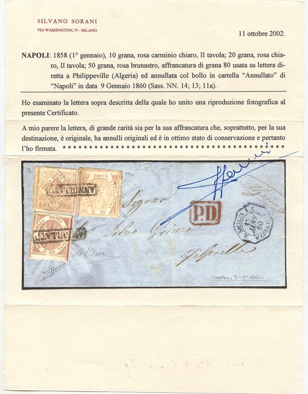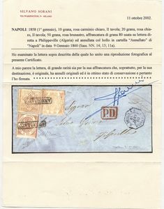 09.01.1860 - Straordinaria lettera da Napoli per Philippeville (Algeria) affrancata per 80 grana tramite un 10gr. rosa carminio chiaro n.11a + 20gr. rosa chiaro n.13 + 50gr. rosa brunastro n.14, tutti ottimamente marginati ed in perfette condizioni. L'affrancatura coreografica insieme alla rarissima destinazione rendono questa lettera probabilmente unica, pertanto è stata giustamente corredata da tre certificati. Cat. 73.500++. (LUX) (Cert. Chiavarello, Cert. Alberto Diena, Cert. Sorani)