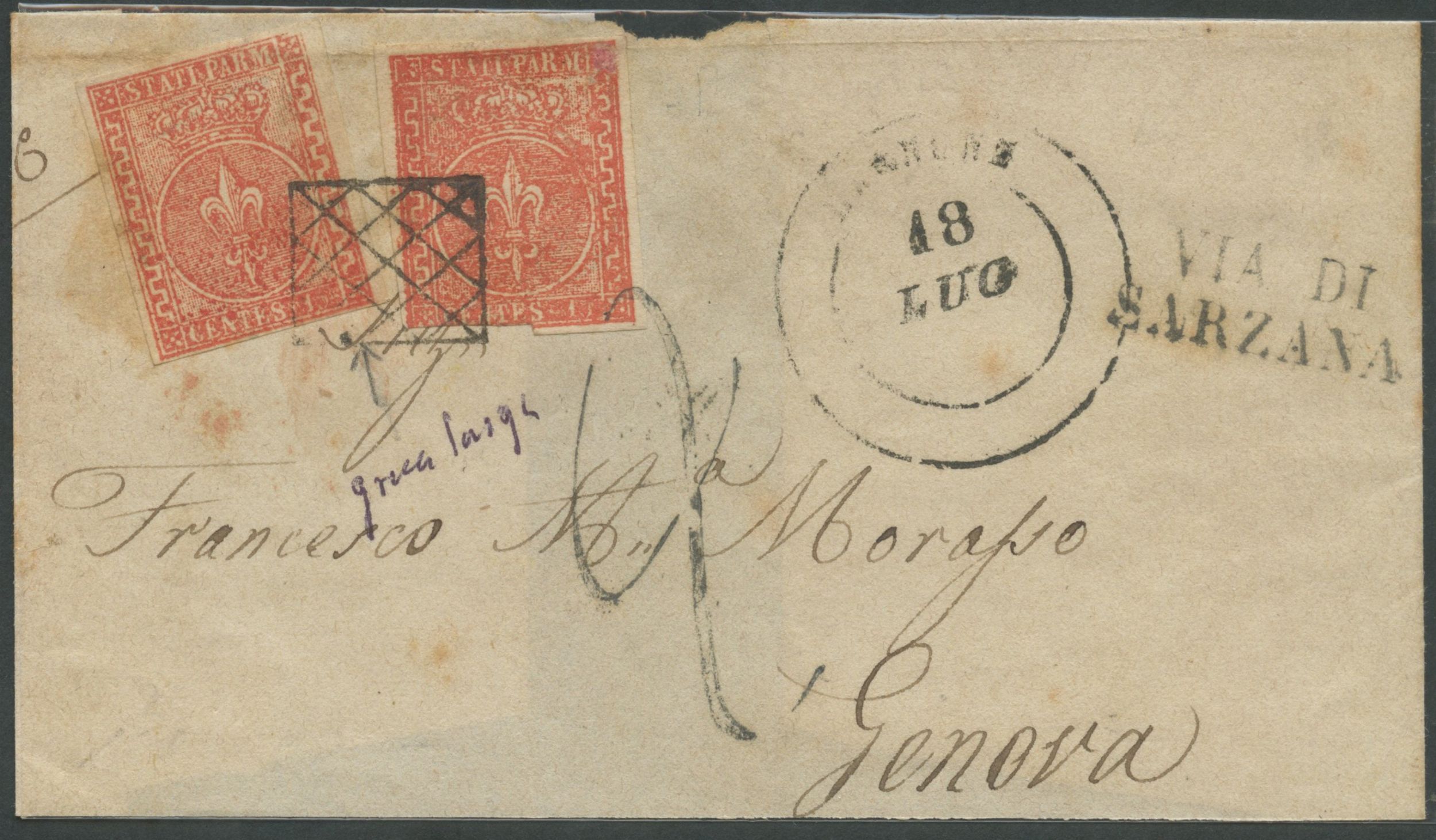 Fronte di lettera spedita da Bagnone per Genova affrancata con due 15c. di cui uno con greca destra larga N.7 e 7c. Sull'affrancature la griglietta di Bagnone (10pt.). Alcuni difetti ma insieme non comune. Cat. 3.950 . (B)