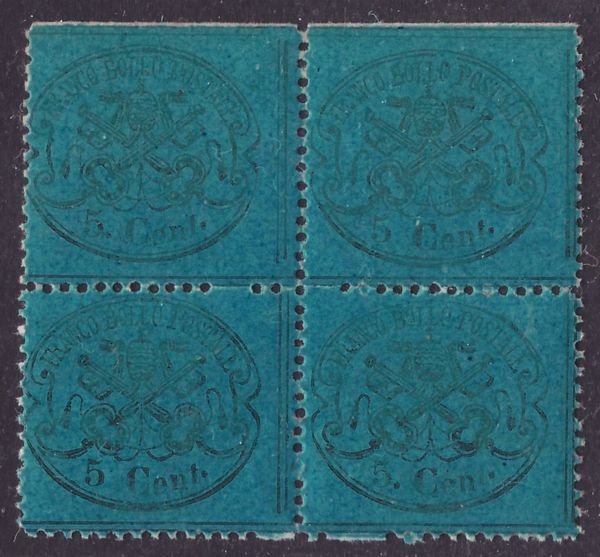 1868 - 5 cent. azzurro scuro in splendida quartina di cui due esemplari con la varietà ''senza punto dopo la cifra'' n. 25d + 25dh, nuova con gomma integra. Cat. 30.000++. (A+) (Cert. Sorani del blocco di provenienza)