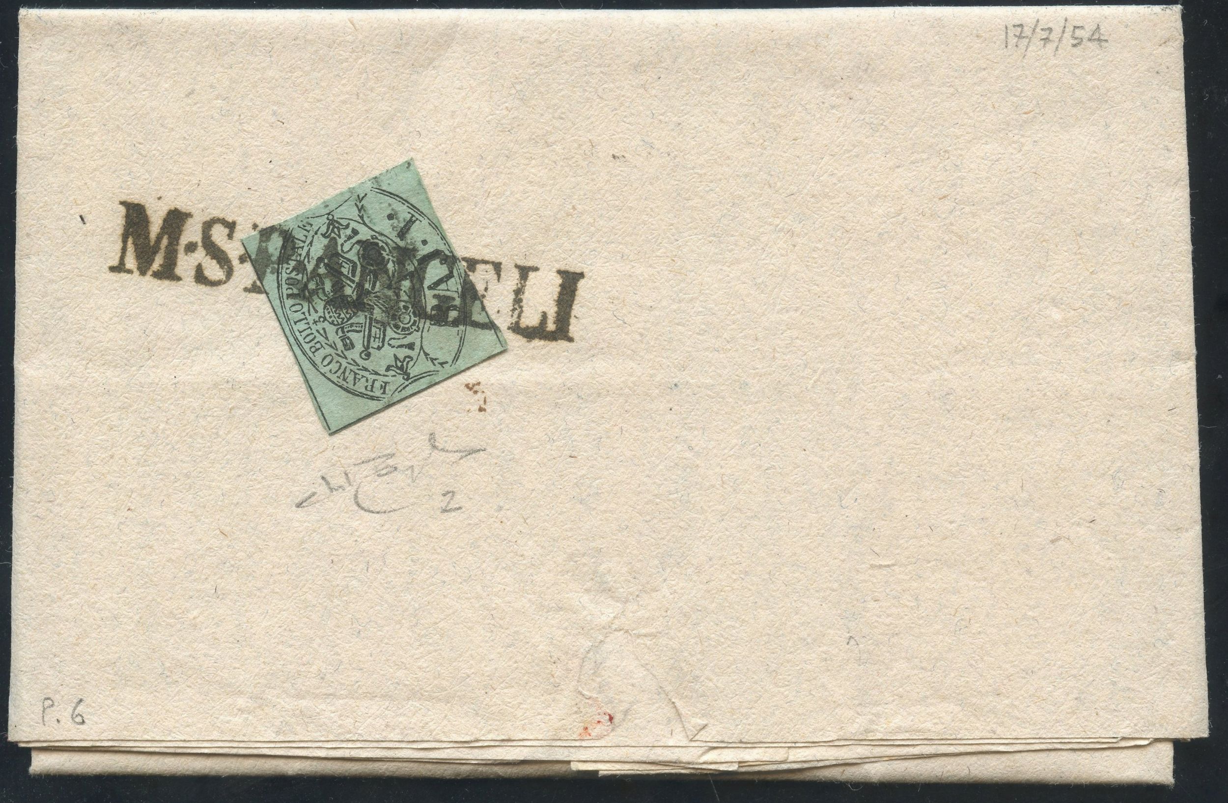 17.07.1854 - Lettera da Monte S. Pietrangeli affrancata tramite 1 baj. verde grigiastro n.2. Sull'affrancatura lo SD di M.S.P.Angeli (6pt.) (A) (Raybaudi)