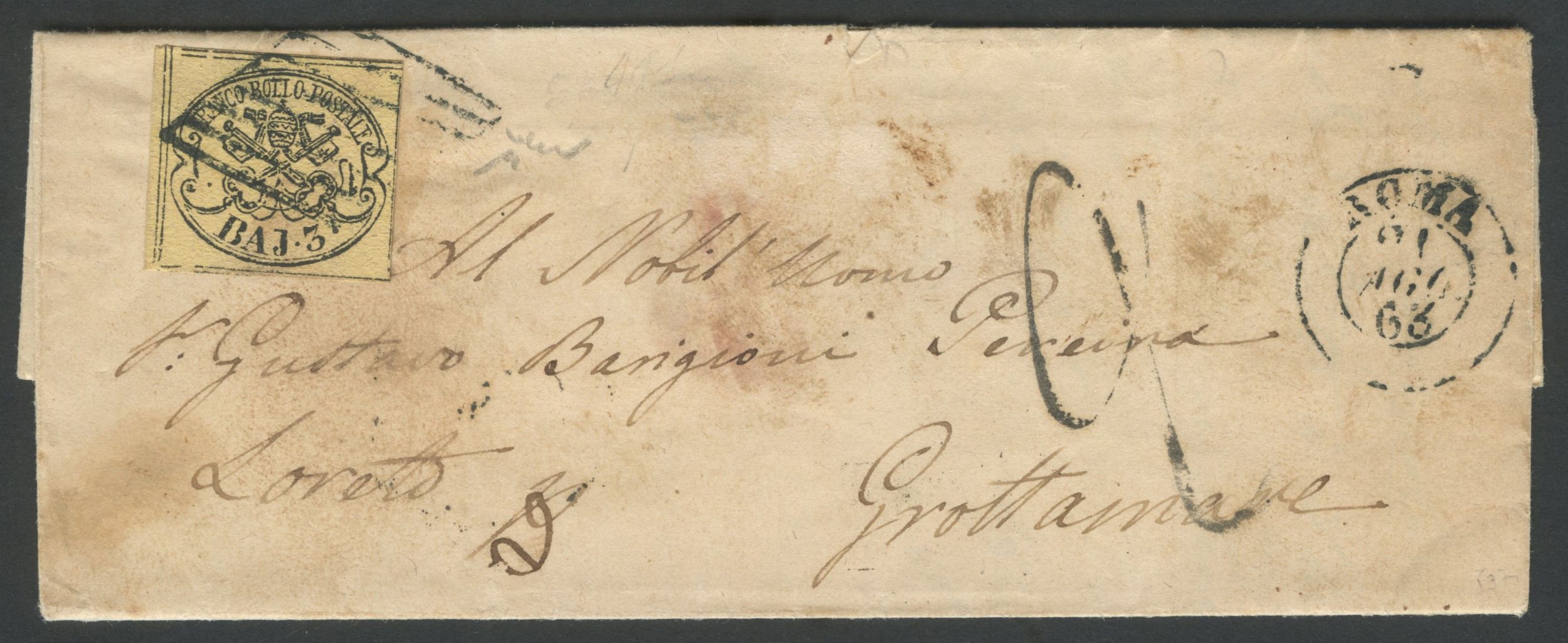 1863 - lettera da Roma per Grottammare ed affrancata tramite un 3 baj giallo cromo n.4A. Cat. 975. (A) (Cert. Chiavarello)