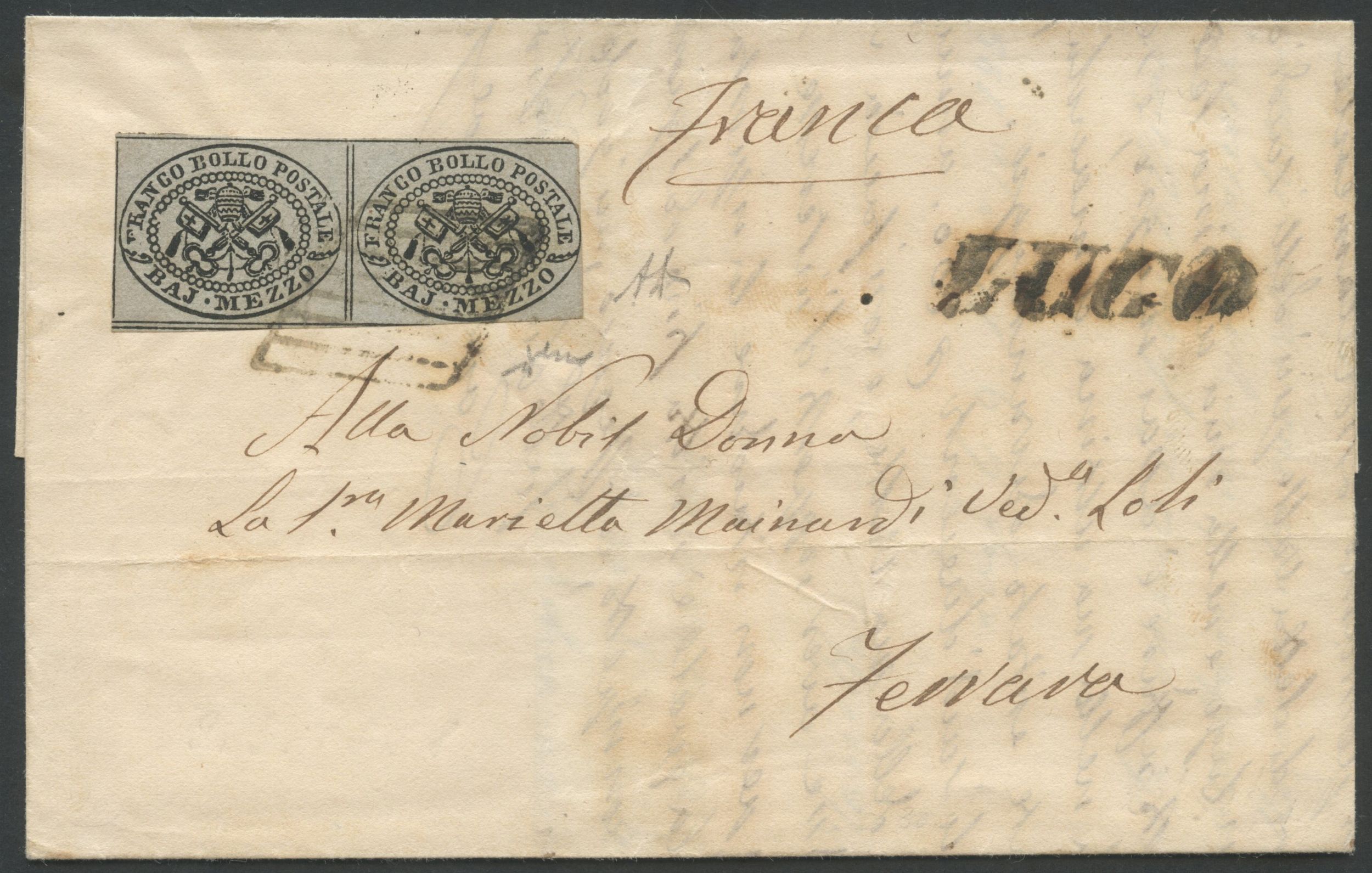10.04.1856 - lettera da Lugo per Ferrara affrancata per 1baj tramite una coppia del 1/2 baj. grigio n.1. Cat. 2.500++. (A) (Alberto Diena, Certificato Chiavarello)