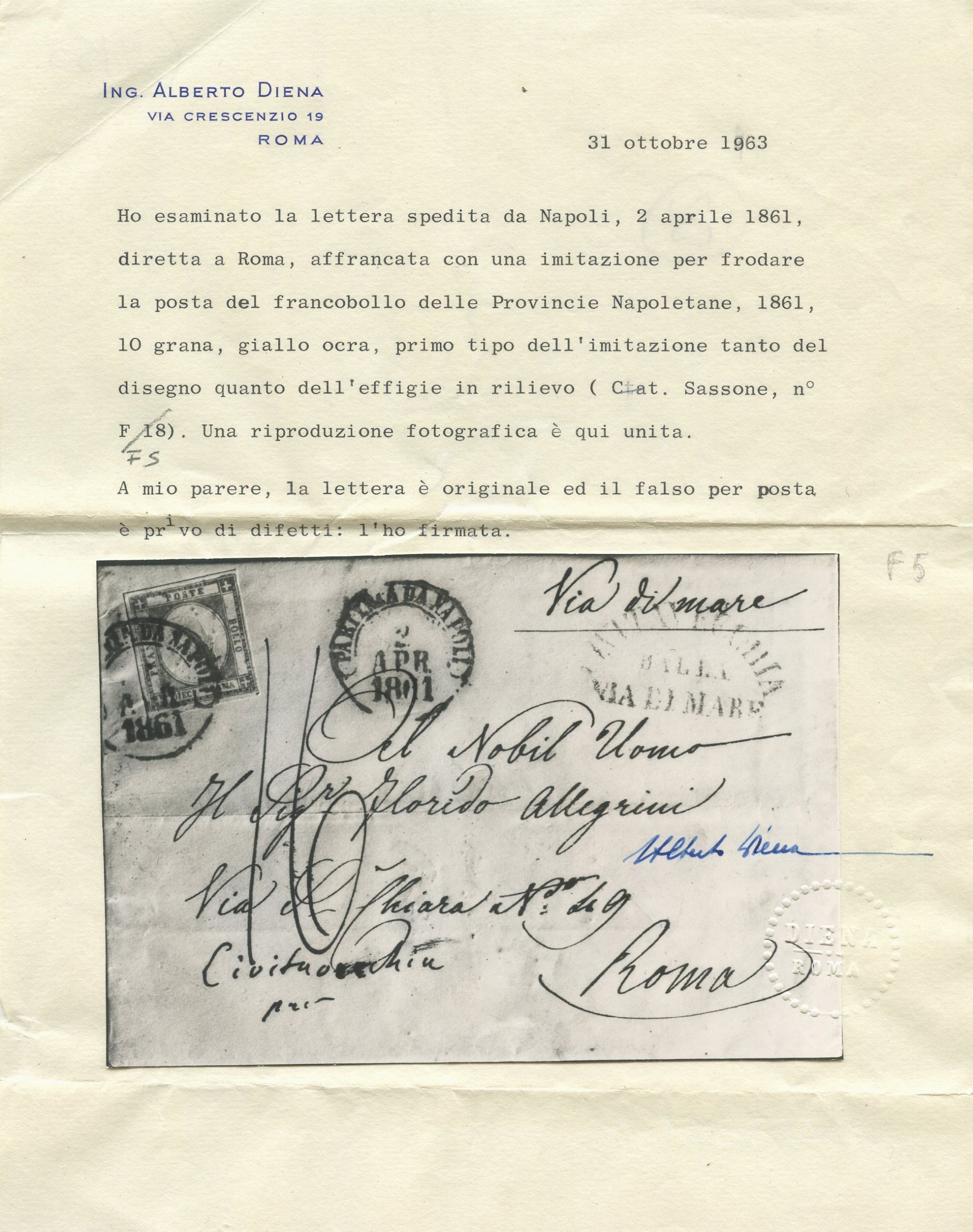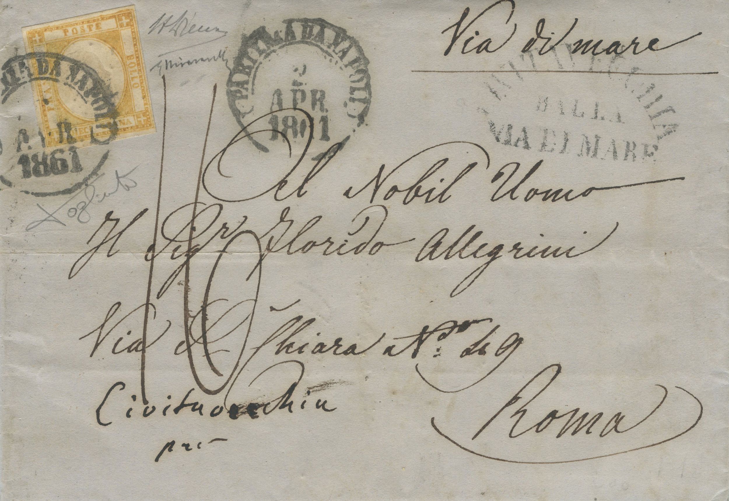 02.04.1861 - Lettera viaggiata per via di mare, inoltrata a Napoli e giunta a Roma il 03.04. La lettera venne affrancata tramite un 10 gr. giallo ocra falso per posta del I tipo con effige del tipo A, n. F5. Insieme di grande pregio. Cat. 19.500. (A+) (Cert. Alberto Diena, Chiavarello per esteso, Tagliente.)