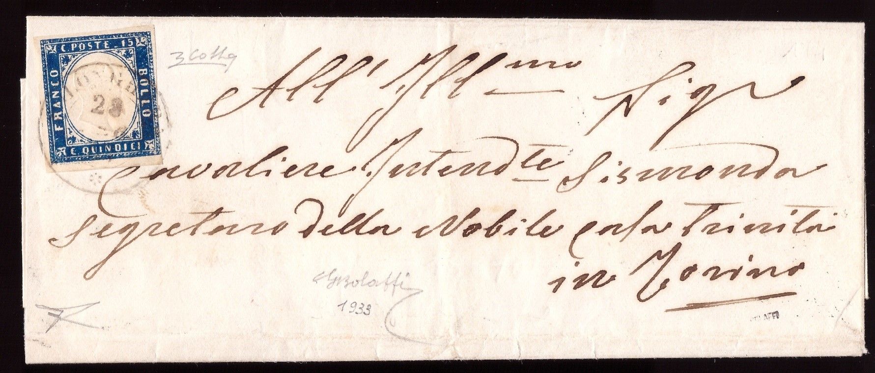 28.02.1863 - Lettera da Polenghera per Torino affrancata tramite un 15 cent. tipo Sardegna n. 11. Sull'affrancatura il DC di POLENGHERA (pt.13). (A-) (Cert. Bottacchi, Bolaffi per esteso)
