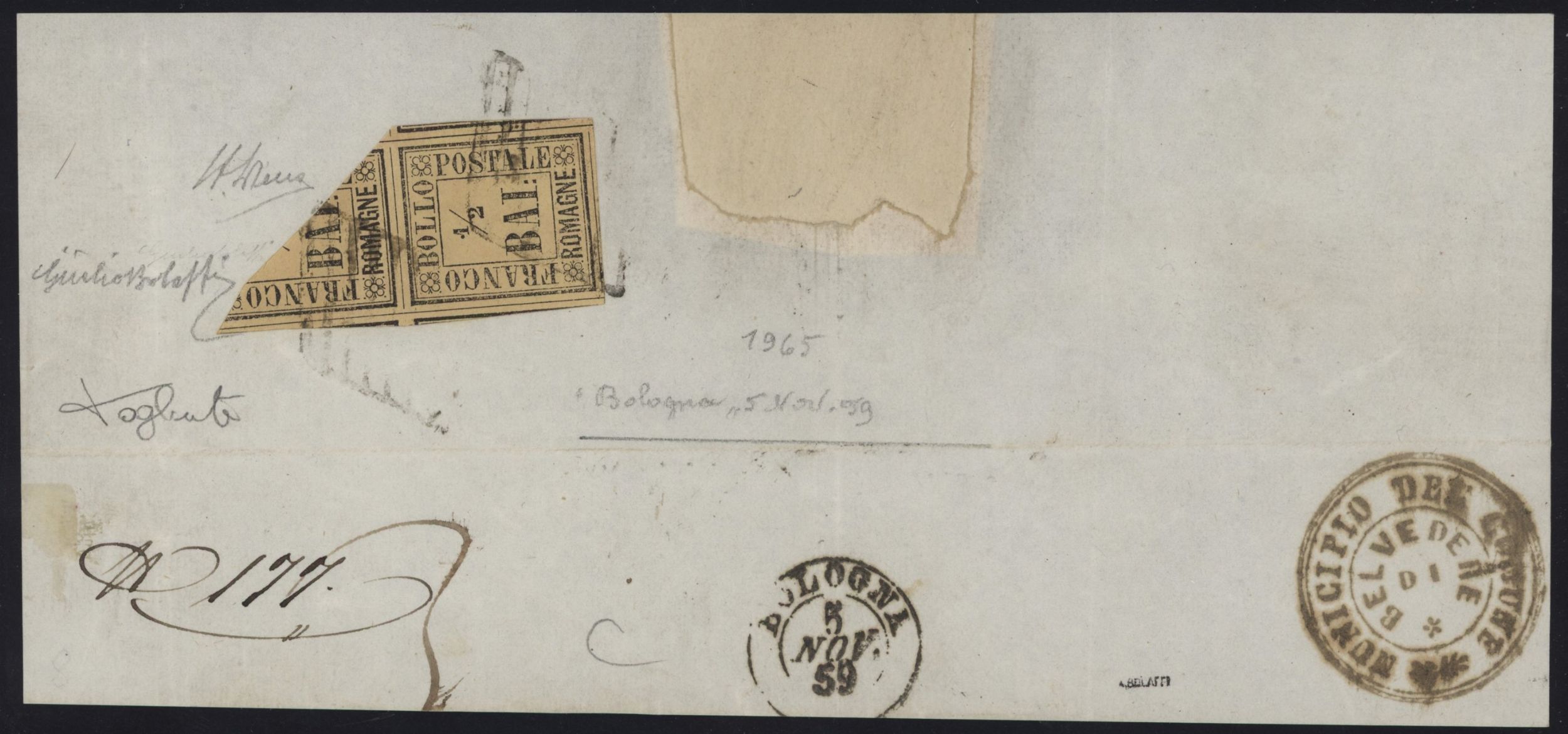 05.11.1859 - Parte di lettera spedita da Bologna ed affrancata tramite una coppia del 1/2 Baj n.1 di cui uno frazionato diagonalmente a metà per andare a comporre la tariffa da 3 centesimi. Cat. 3.750. (LUX) (Bolaffi per esteso, Alberto Diena per esteso, Tagliente)