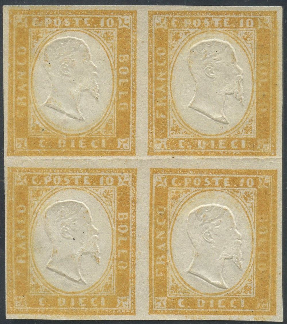 1862 - 10 centesimi giallo ocra n.14Dd gommato al recto in splendida quartina nuova. Il blocco è impreziosito dalla presenza di piccola e grande incrinatura. Cat. 24.000++. (A)