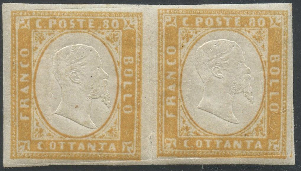 1858 - 80 cent. ocra arancio in splendida coppia nuova con gomma originale, MH. cat. 800++. (A+) (Alberto Diena)
