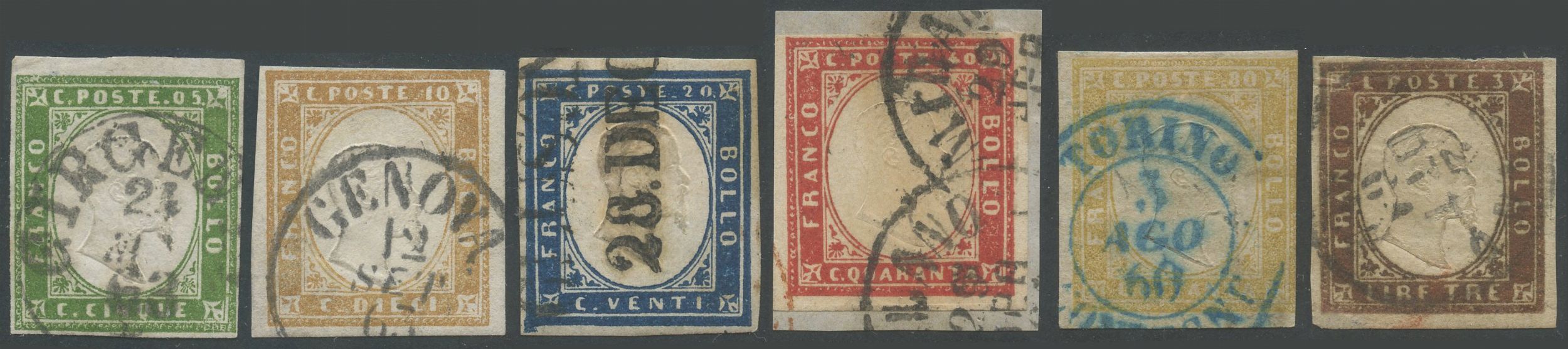 1855 - IV emissione di Sardegna, la serie usata con annulli originali.  Il 3Lire firmato per esteso da Emilio Diena e con certificato storico Alberto Diena. Cat. 9.400++.