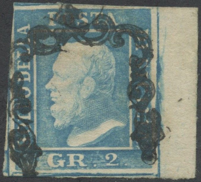 Italia - Sicilia... 1858 - 2 gr. azzurro chiaro n.8 con bordo di foglio a destra, tre ampi margini, il sinistro a filo ma completo. (A) (Sorani)
