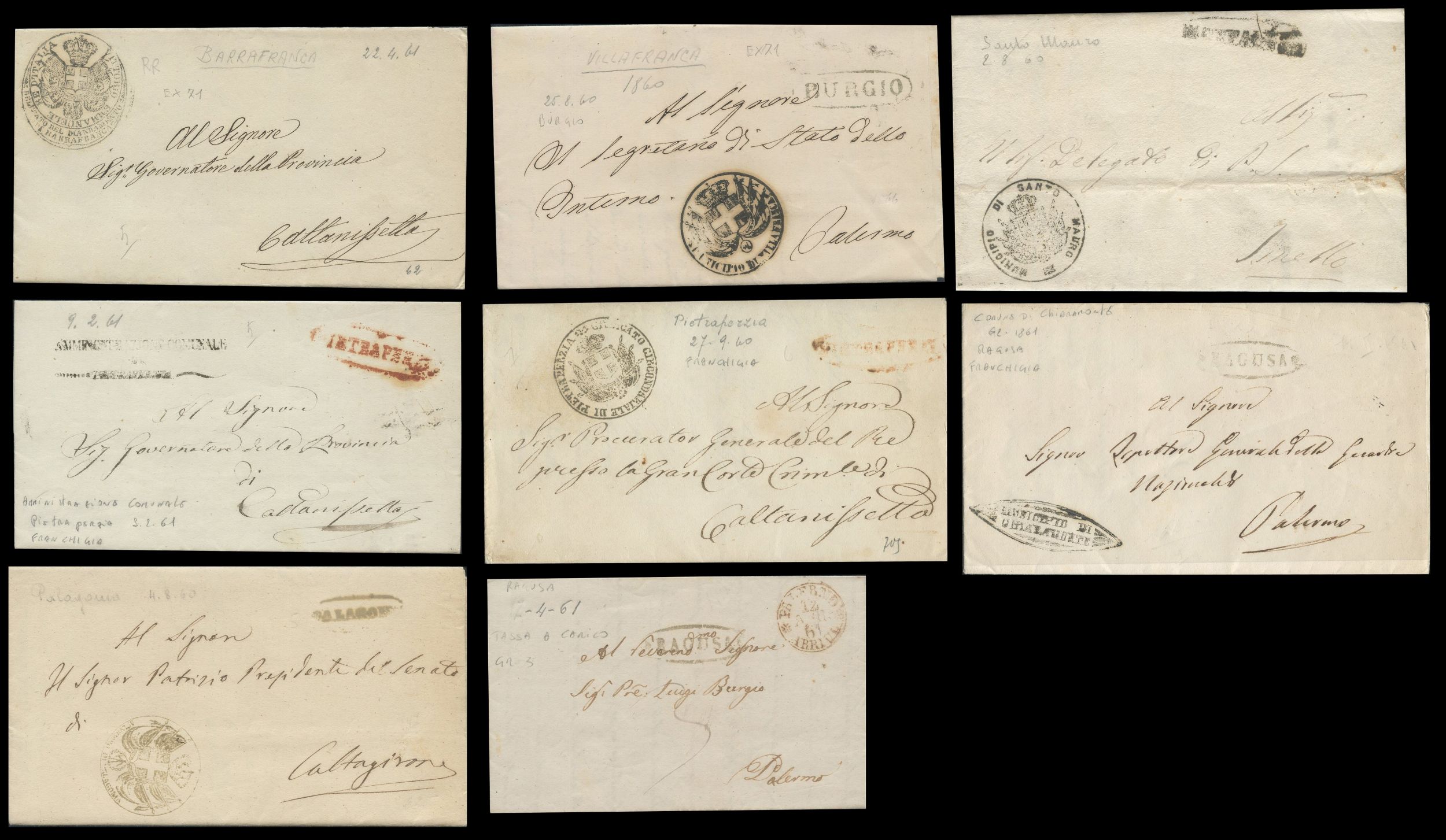 Interessante insieme di 8 lettere del periodo non affrancate con annulli tutti diversi.