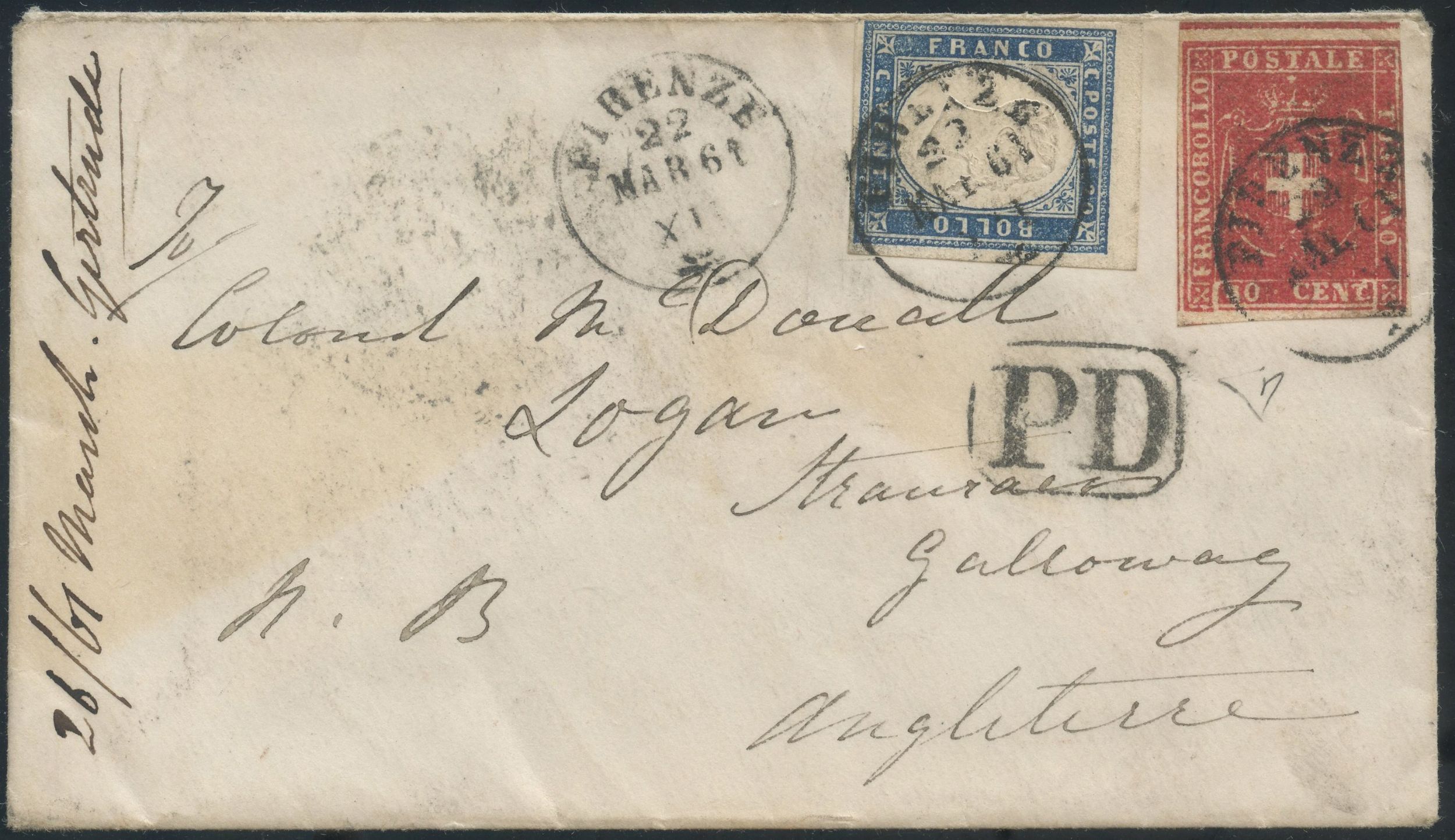 22.03.1861 - Busta spedita da Firenze per L'Inghilterra affrancata per 60 centesimi tramite un valore da 20 cent. della IV emissione di Sardegna + 40 cent. del Gov. Prov. di Toscana (n.14Dc + 21). Il raro oggetto è notevolmente impreziosito dal bordo di foglio superiore del 40 cent. con linea di riquadro completa. Insieme di grande rarità . Cat. 42.500++ . (A-) (Cert. Enzo Diena)