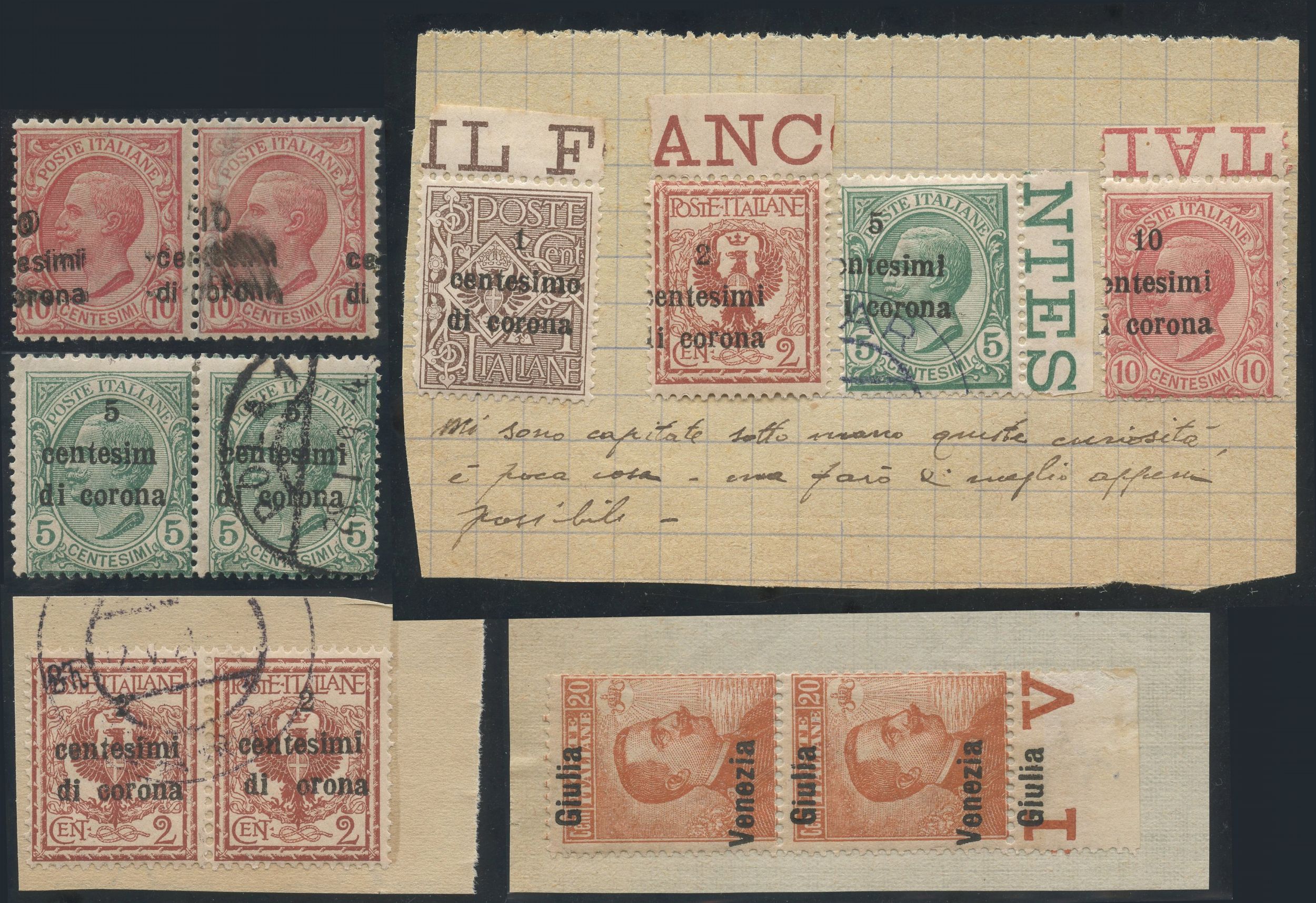 1919 - Piccolo insieme di varietà , misti nuovi con gomma integra, linguellati e usati. Unita una coppia soprastampata Venezia Giulia fortemente spostata in senso verticale ''Giulia Venezia'' ed uno dei due esemplari con bordo di foglio in modo da creare la dicitura ''Giulia Venezia Giulia''. (A)