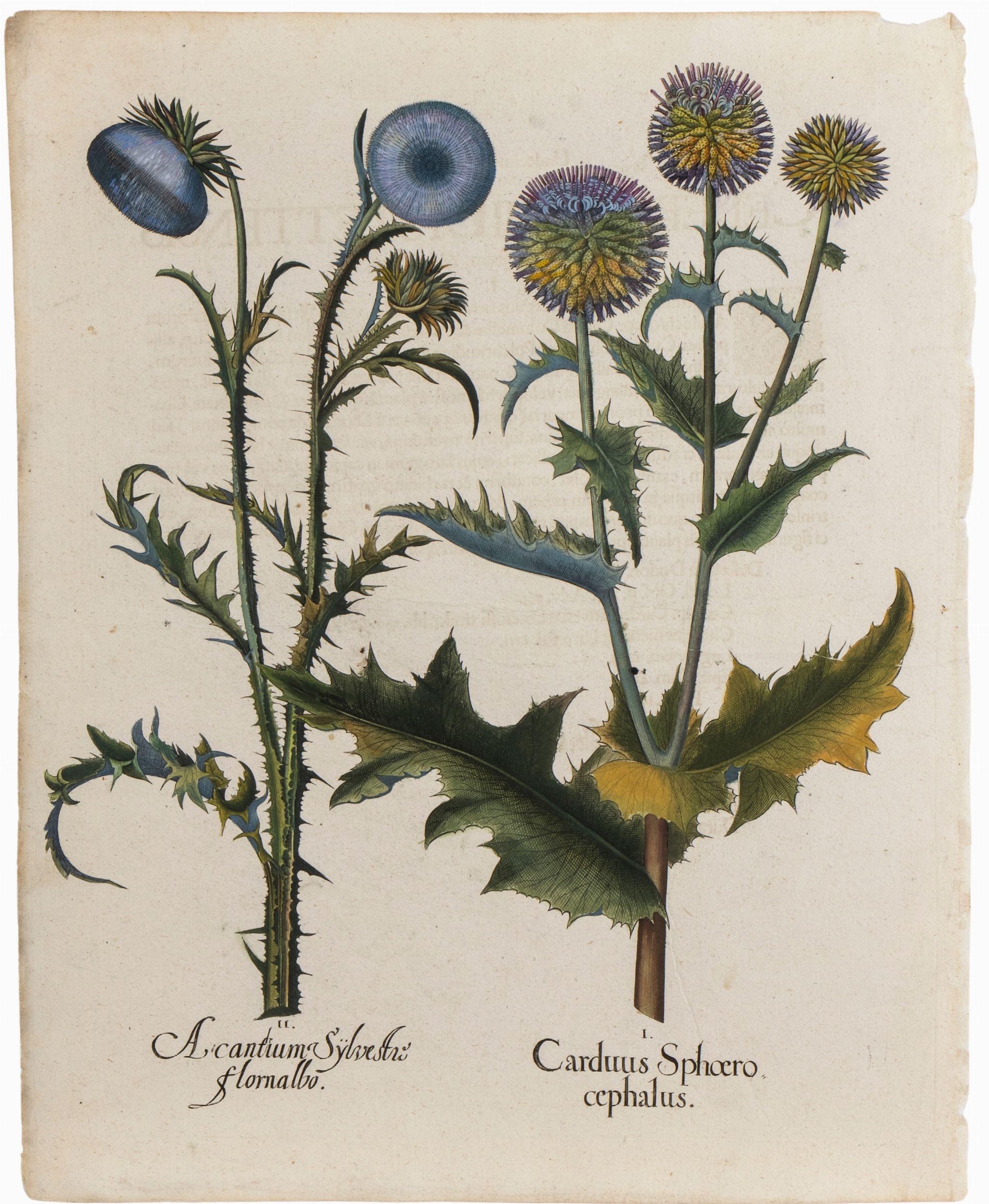 Tavola tratta dal famoso erbario Hortus Eystettensis (1613). Bulino e acquaforte, 525 x 420 mm (foglio). Bellissima impressioni con splendida coloritura coeva. Stampata su carta vergata. Visibile il segno della battuta. In ottimo stato di conservazione.