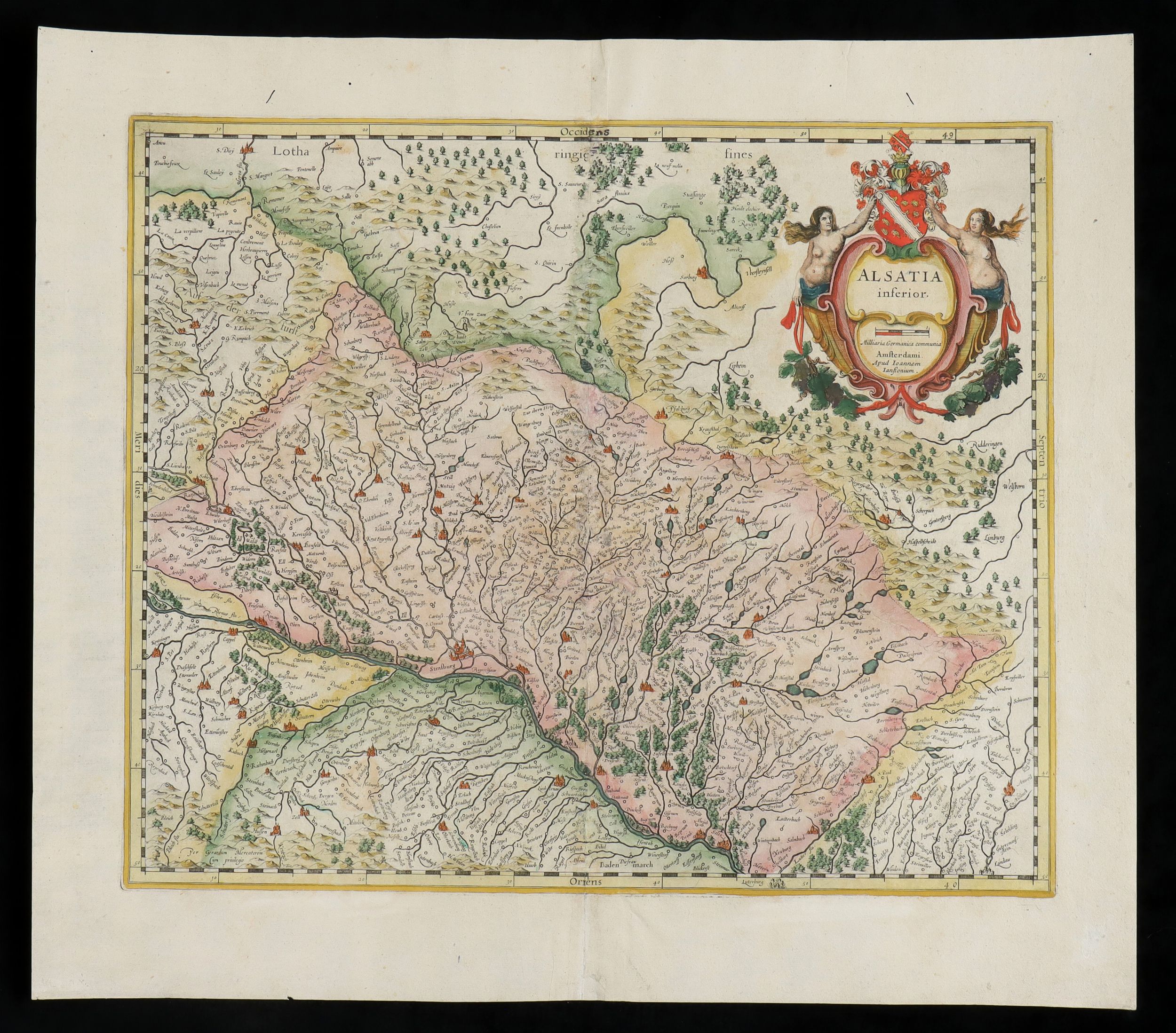 Acquaforte e bulino, 36,2 x 43,5 cm (lastra); 45,2 x 51 cm (foglio). Mappa dell'Alsazia, una regione storica della Francia Nord-orientale, pubblicata da Johannes Janssonius ad Amsterdam. Stampata su carta vergellata, due fogli uniti, testo in inglese sul verso. Bella coloritura coeva. In generale foglio in ottimo stato, salvo qualche piccolissimo foro, qualche assottigliamento della carta e lievi macchie al verso e lungo la piega centrale.