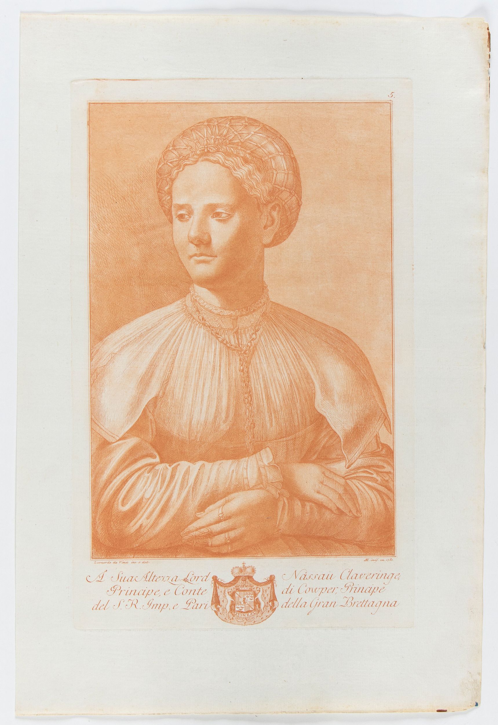 1870 da un disegno conservato al Gabinetto Disegni e Stampe degli Uffizi, già attribuito al Leonardo e poi a Pontormo. Tratta da 'Disegni originali di eccellenti pittori esistenti nella R.Galleria di Firenze...' Acquaforte ad inchiostro rosso, 485 x 304 mm (lastra), 615 x 415 mm (foglio). LeBlanc 101. Bellissima impressione su carta vergata con filigrana (Heawood 2930) . In ottimo stato di conservazione.