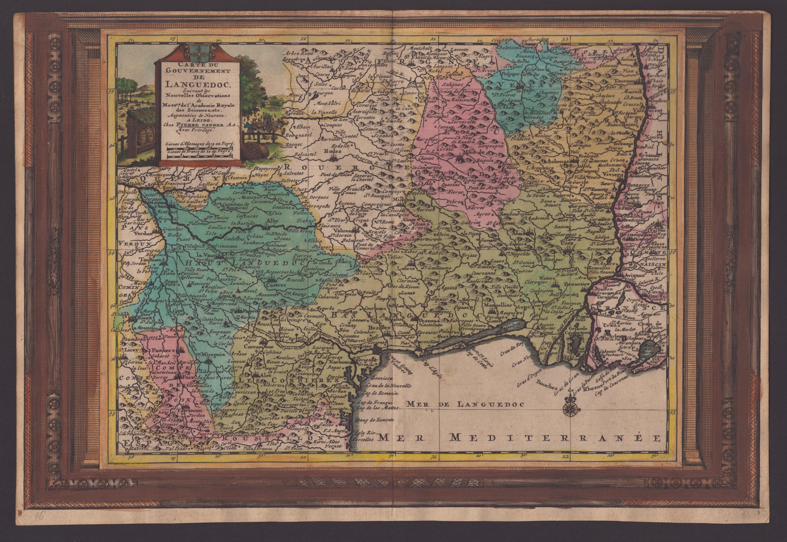 Acquaforte e bulino, 267 x 392 mm (foglio). Mappa della terra di Linguadoca, nel sud della Francia, tratta da 'Le Nouveau Theatre'. Bella impressione su carta vergata con filigrana e coloritura coeva. Esemplare controfondato su un altro foglio di carta vergata. Consueta piega editoriale, per il resto in buono stato.