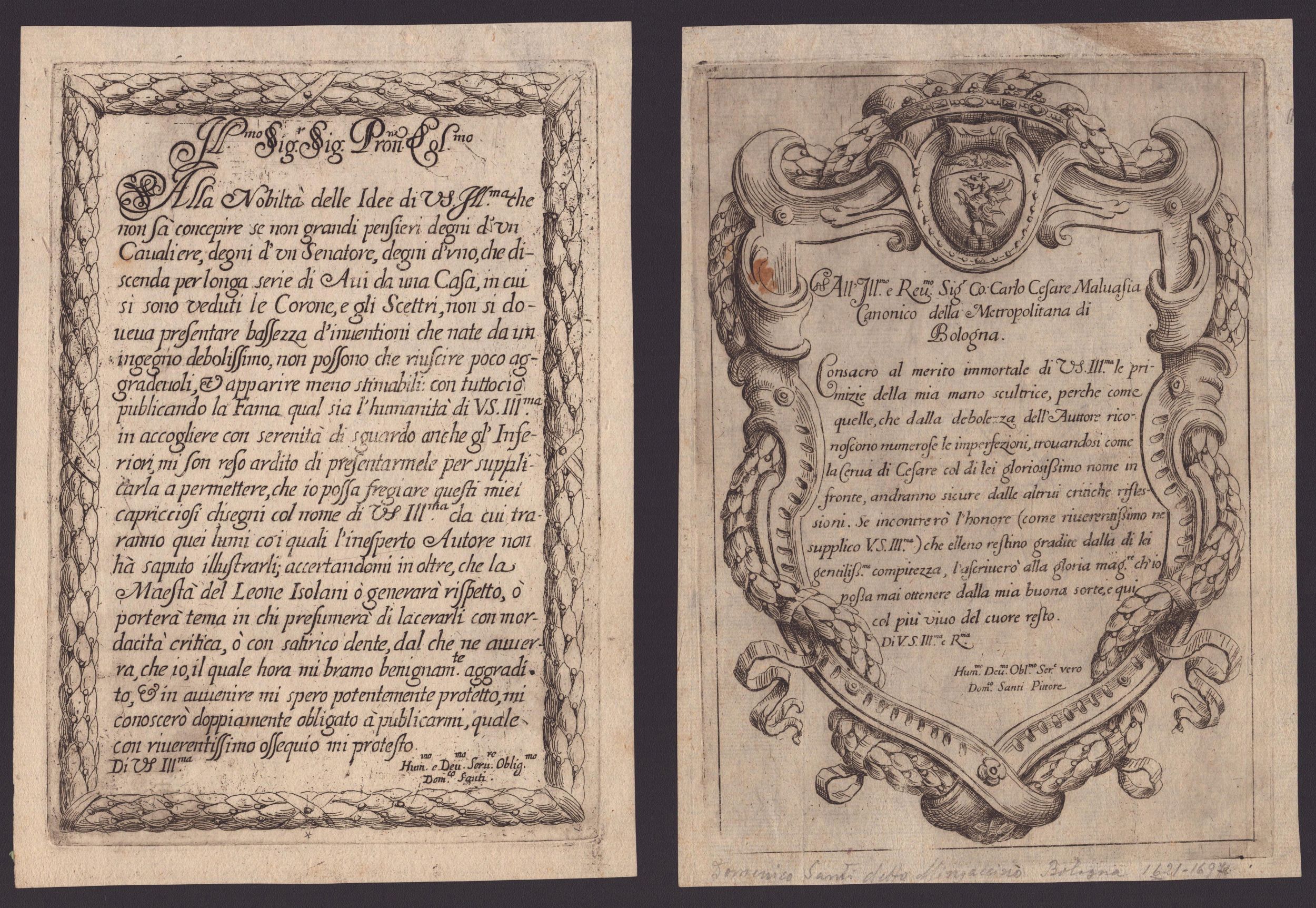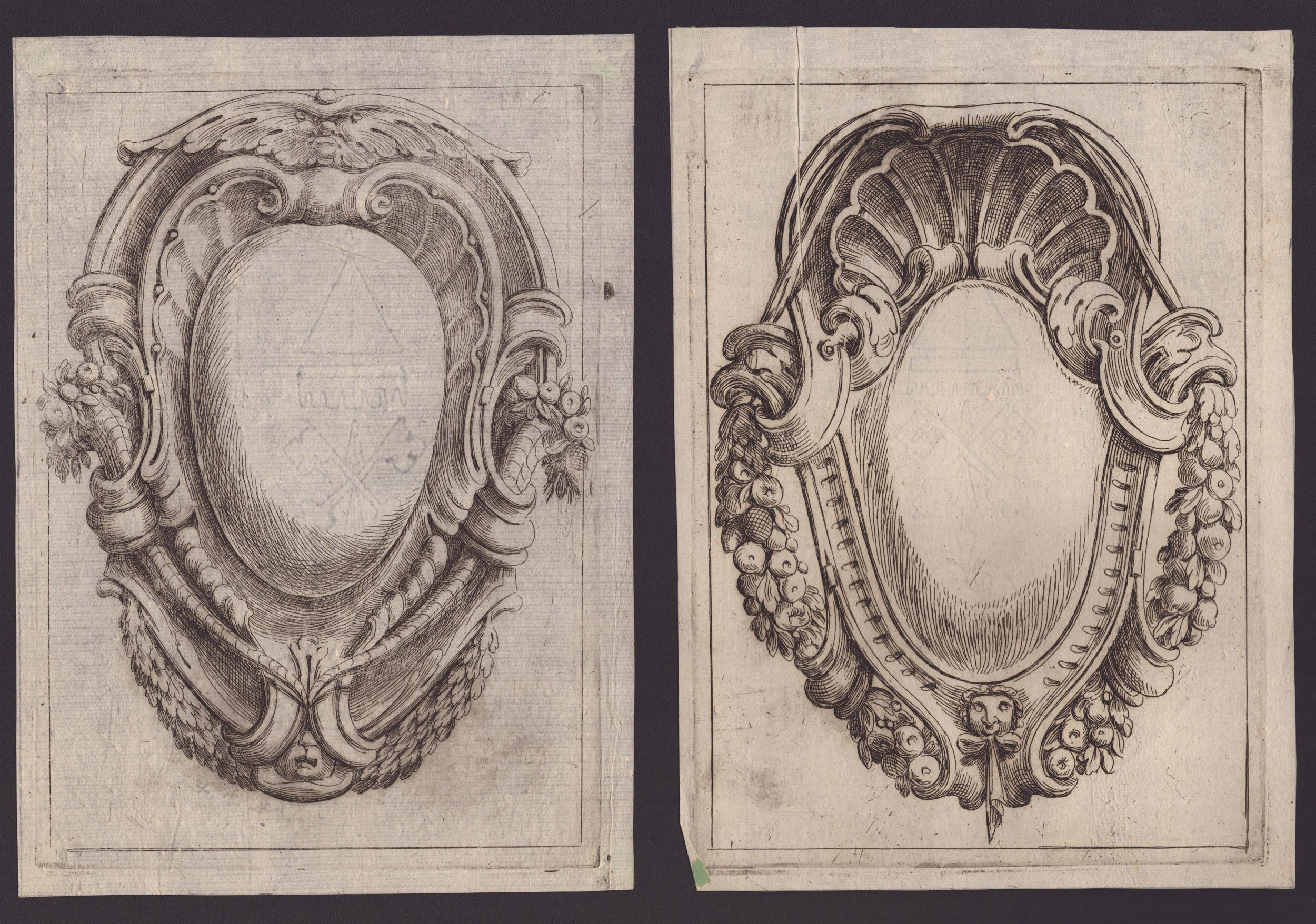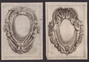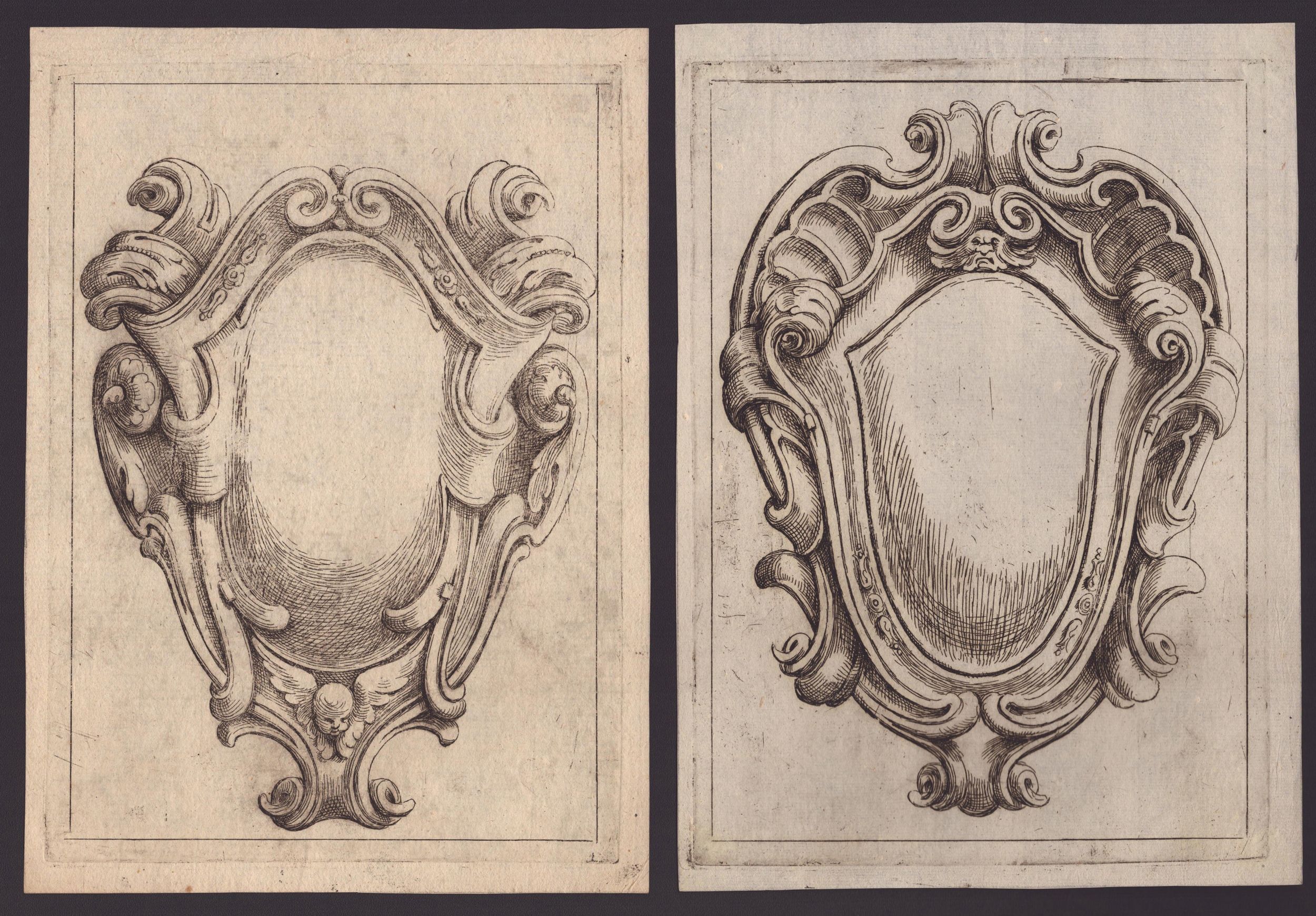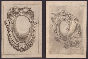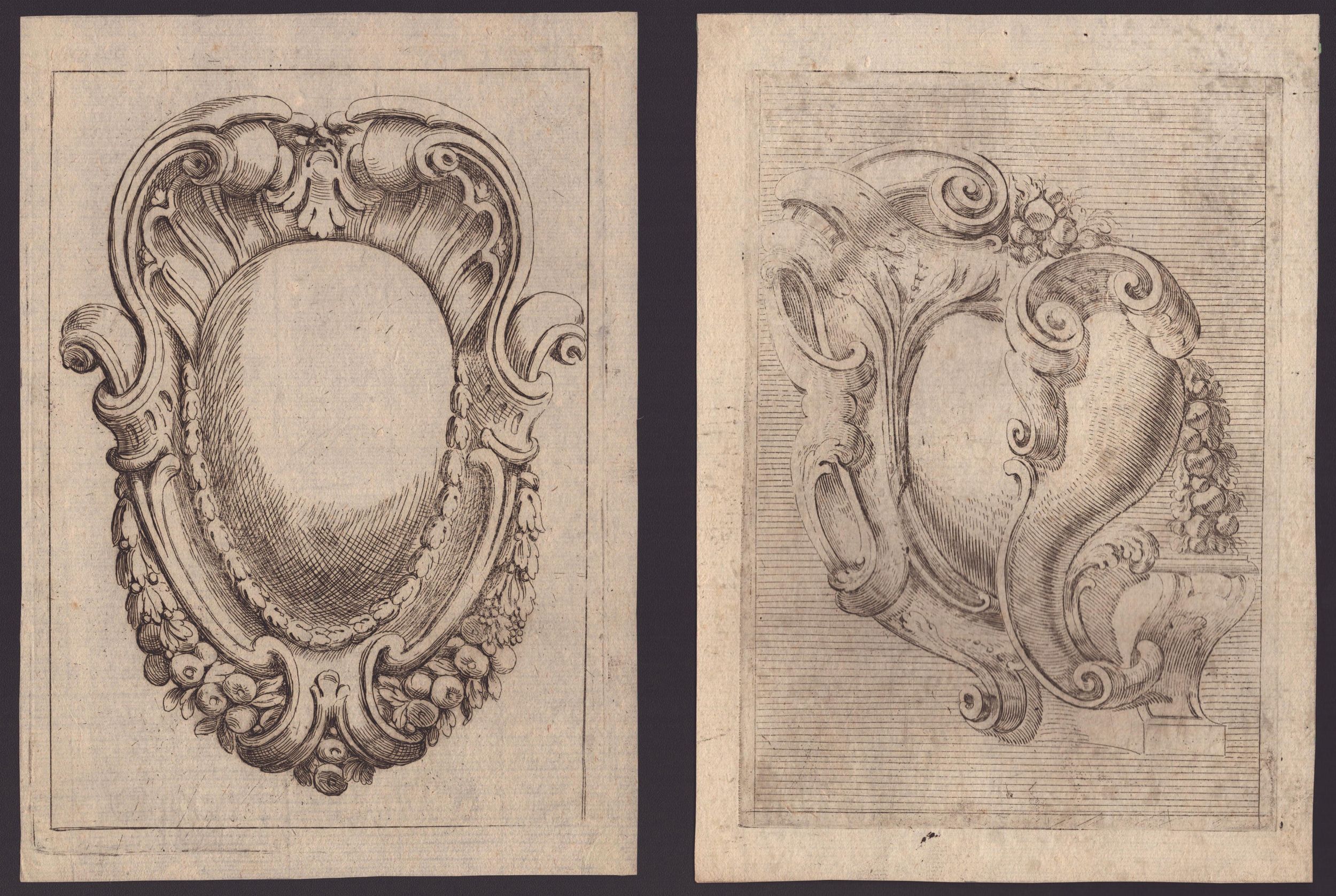 ca. 1695 Totale di 11 tavole tratte dalla opera dedicata 'All'Ill.mo e Rev.mo Sig. Co: Carlo Cesare Malvasia...', da 'Campi Ornati Opera Seconda' e da 'Campi Ornati Opera Terza'. Acquaforte, 240 x 170 mm ca. (cad. lastra), 254 x 184 mm (cad. foglio). Katalog der Ornamentstichsammlung der Staatlichen Kunstbibliothek Berlin 577. Belle, fresche e nitide impressioni, alcune con plete-tone. Stampate su carta vergata con filigrane (4 filigrane diverse). In generale in ottime condizioni salvo residui di carta azzurra al verso.