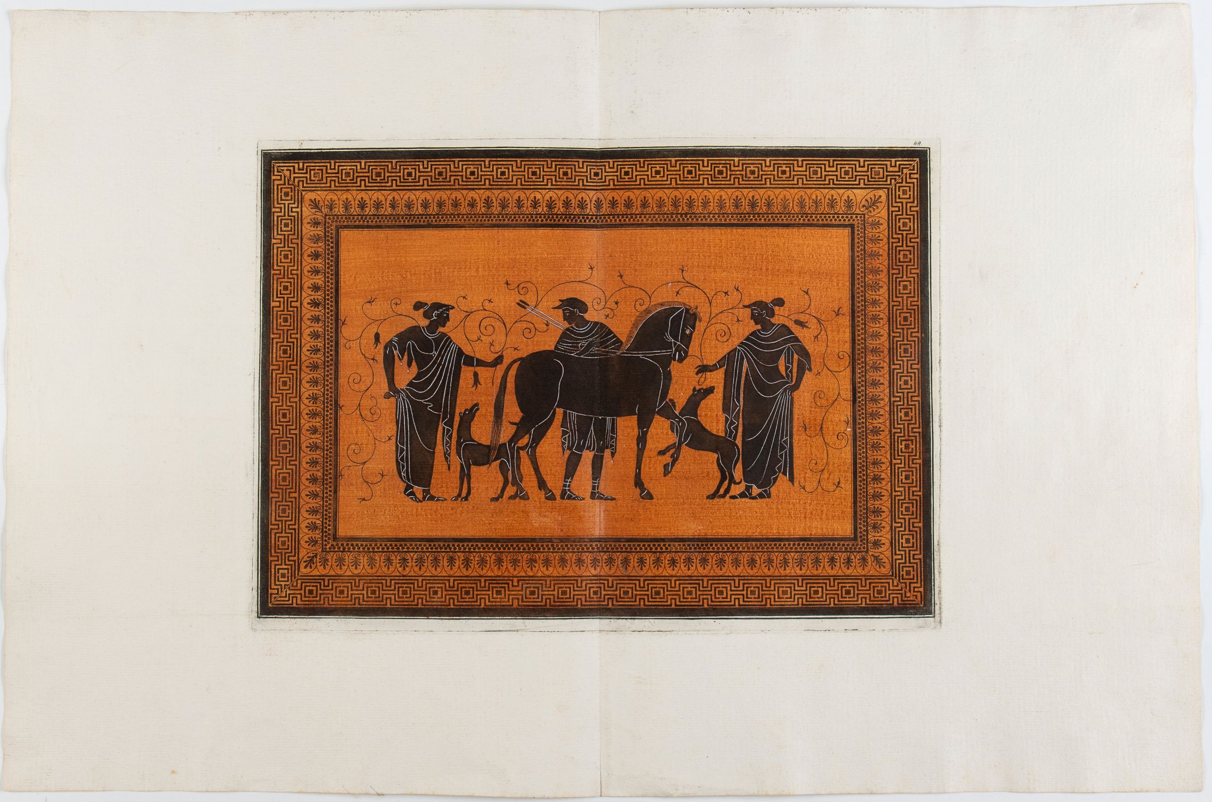 Acquatinta, 297 x 416 mm (lastra), 475 x 720 mm (foglio). Tavola tratta da 'Collection Of Etruscan, Greek, And Roman Antiquities...' Superba, brillante impressione a tre colori su due fogli uniti di carta vergata con filigrana. In ottimo stato di conservazione – con consueta piega editoriale e dei residui cartacei al verso.