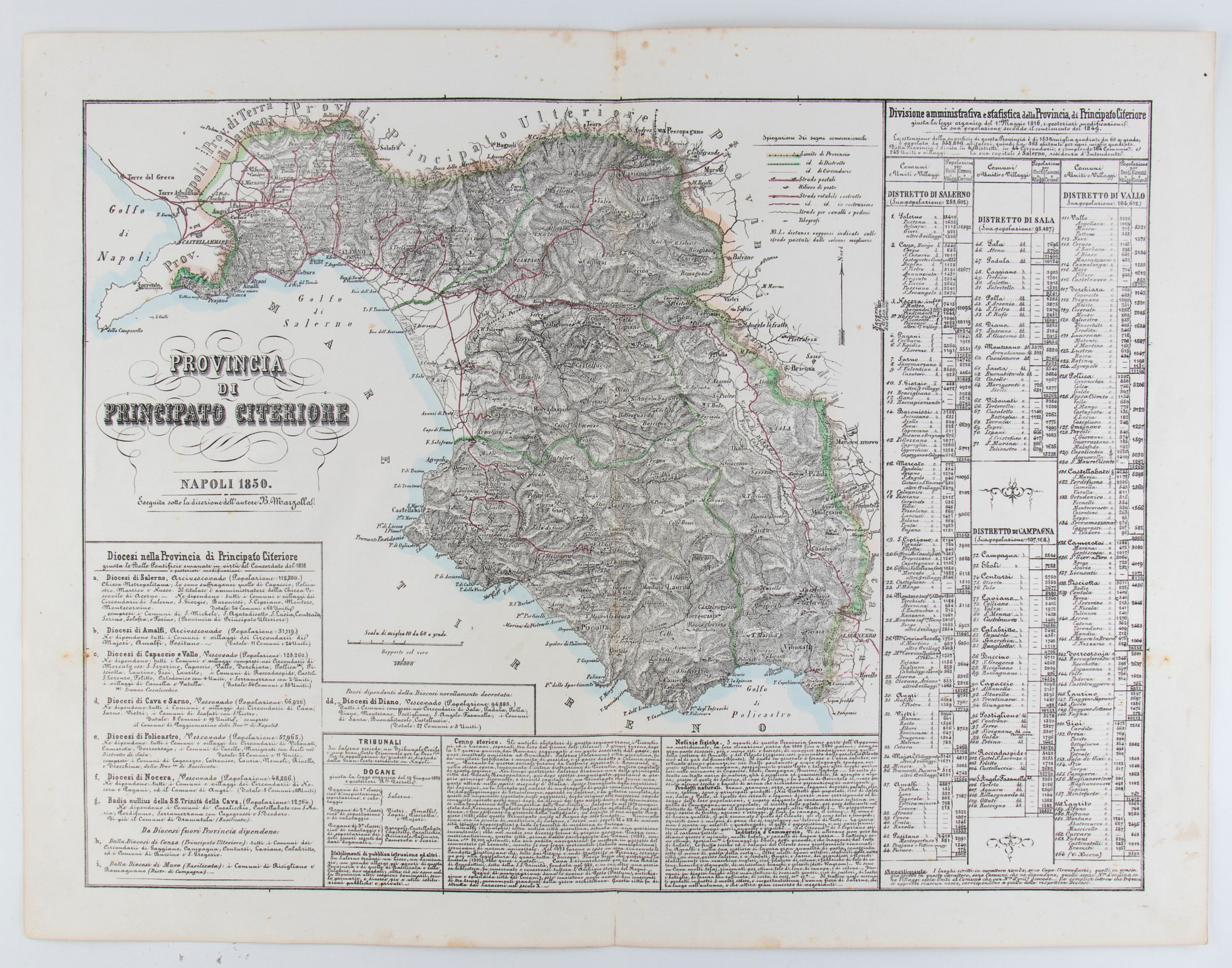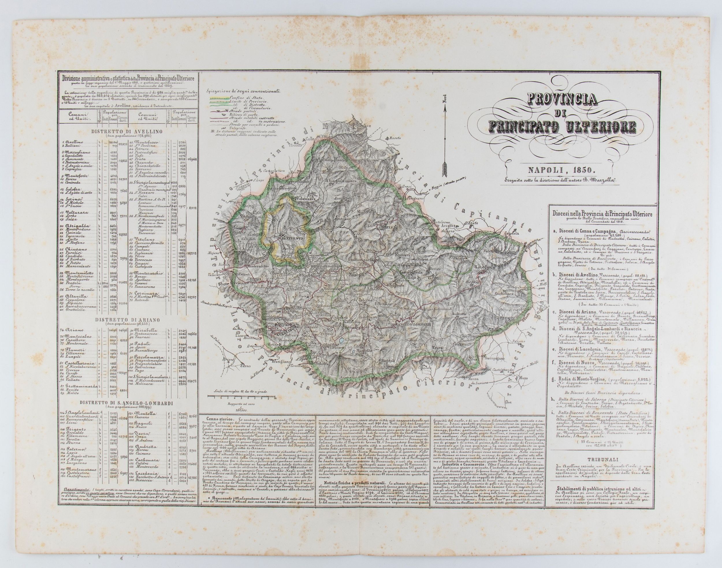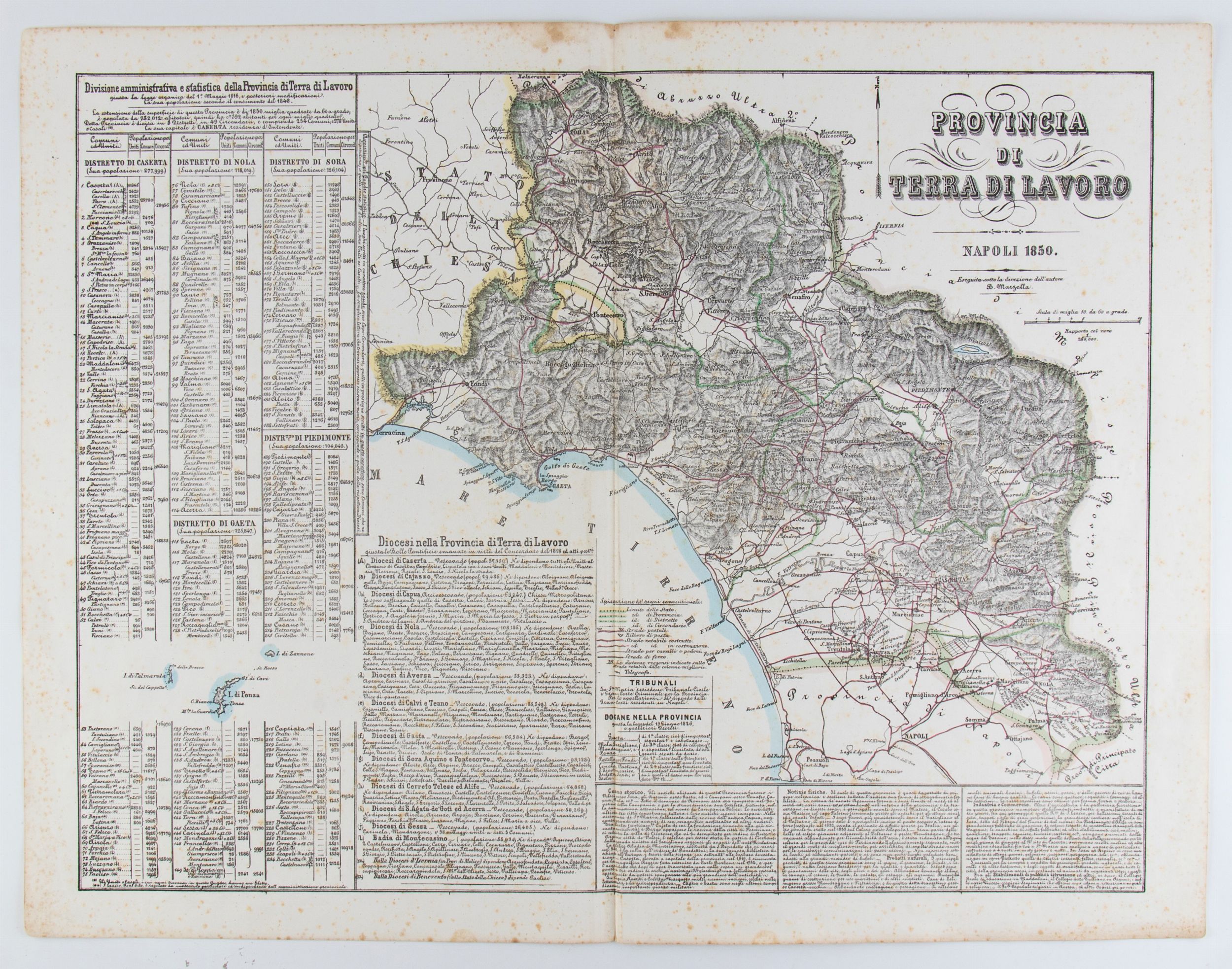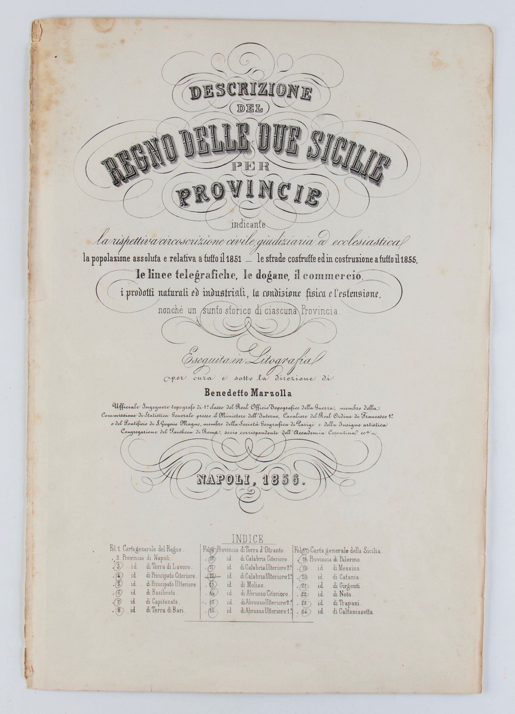 Napoli 1856 Lotto di 21 mappe tratte dall'atlante cartografico di Marzolla, raffiguranti le province del Regno delle Due Sicilie, inclusi: Basilicata, Bari, Otranto, Calabria, Molise, Abruzzo, Palermo, Messina, Catania, Trapani. Litografia, 510 x 700 mm ca. caduta. Mappe in molto buono stato salvo fioriture sparse.