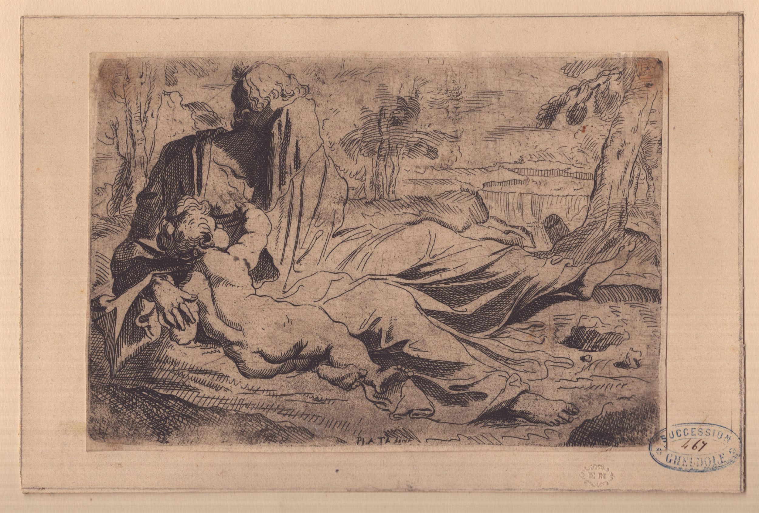 Acquaforte, 132 x 193 mm. Stupenda impressione con plate-tone, stampata su carta vergata. Esemplare con piccoli margini di circa 2 mm su ogni lato. Applicato in tre punti su un supporto con due marchi da collezione: GHELDOLF (Lugt 1080) e un marchio non identificato (Lugt 885).